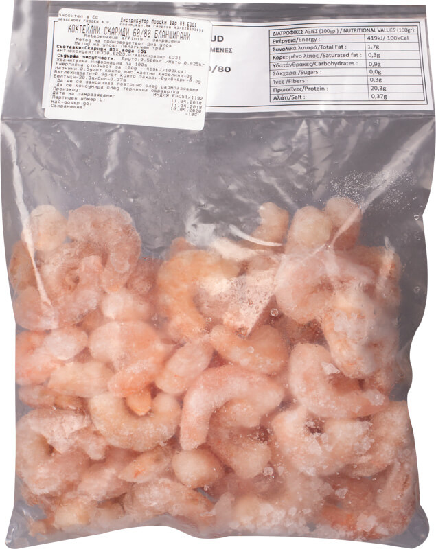Скариди розови, белени, нланширани, замразени 60/80 Гърция 500гр.