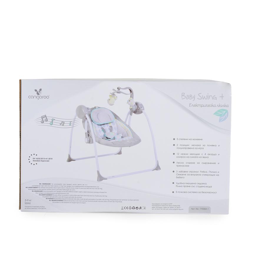 Електрическа люлка Baby Swing+ предоставя на детето удобство, забавление и спокоен сън. Подходяща е за ползване от самото раждане до достигане на максимално тегло от 9 кг. Чудесно място за сладък бебешки сън и любимо място за детски игри и забавления. Люлката има 5-степени на люлеене, които са обозначени със светещи индикатори и е с автоматично изключване след 15, 30 или 60 минути, нежни мелодии и природни звуци.