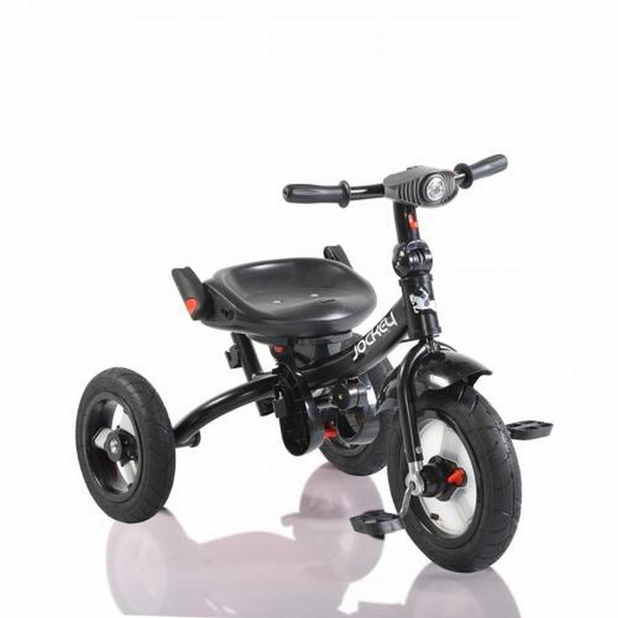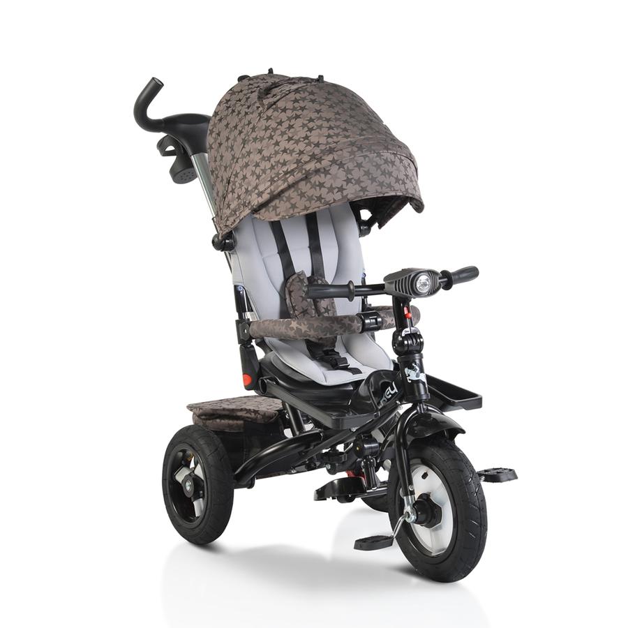 За деца на възраст от 12 до 72 месеца и с максимално тегло до 28 кг; Надуваеми гуми - предна 12 инчова, задни - 10 инчови; Предно колело с функция за фиксиране на педалите - колелото се движи свободно, а педалите са в едно положение и не могат да контролират колелото. Регулируема дръжка за родителски контрол, контролираща посоката на движение на предното колело. Регулируемо кормило; Две поставки за крачетата: за по-малки деца и сгъваема за по-големи деца. Регулируем сенник; Въртяща се на 360° седалка; Облегалка - с 2 положения на лягане; Мек предпазен борд, мека сваляема подложка седалка, пет-точкови предпазни колани, две задни спирачки и задна кошница за играчки, музикално табло със светлини.