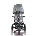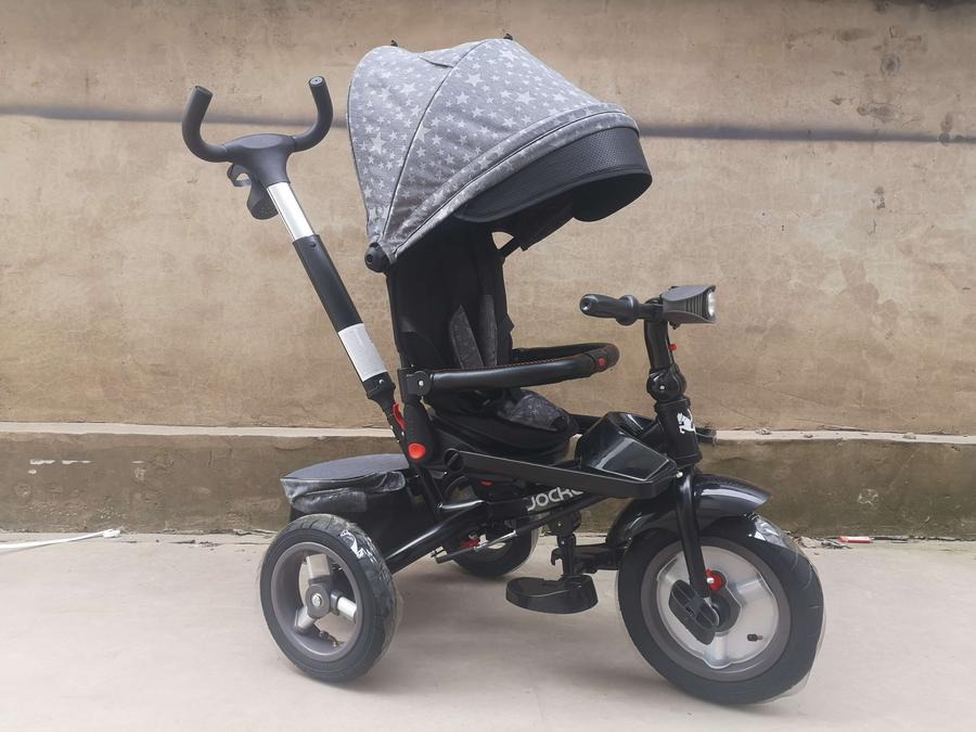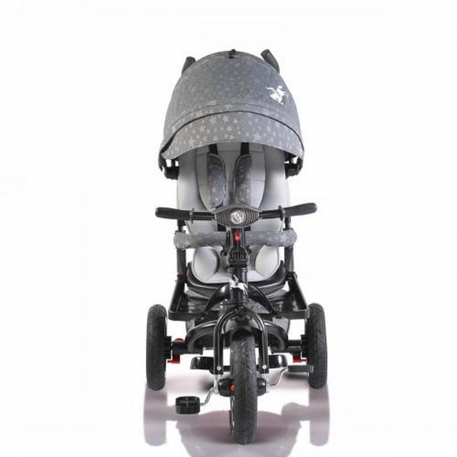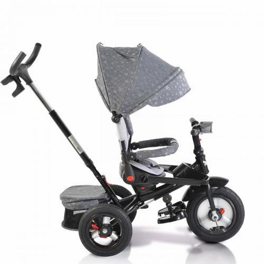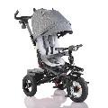 За деца на възраст от 12 до 72 месеца и с максимално тегло до 28 кг; Надуваеми гуми - предна 12 инчова, задни - 10 инчови; Предно колело с функция за фиксиране на педалите - колелото се движи свободно, а педалите са в едно положение и не могат да контролират колелото. Регулируема дръжка за родителски контрол, контролираща посоката на движение на предното колело. Регулируемо кормило; Две поставки за крачетата: за по-малки деца и сгъваема за по-големи деца. Регулируем сенник; Въртяща се на 360° седалка; Облегалка - с 2 положения на лягане; Мек предпазен борд, мека сваляема подложка седалка, пет-точкови предпазни колани, две задни спирачки и задна кошница за играчки, музикално табло със светлини.