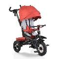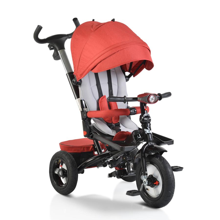 За деца на възраст от 12 до 72 месеца и с максимално тегло до 28 кг; Надуваеми гуми - предна 12 инчова, задни - 10 инчови; Предно колело с функция за фиксиране на педалите - колелото се движи свободно, а педалите са в едно положение и не могат да контролират колелото. Регулируема дръжка за родителски контрол, контролираща посоката на движение на предното колело. Регулируемо кормило; Две поставки за крачетата: за по-малки деца и сгъваема за по-големи деца. Регулируем сенник; Въртяща се на 360° седалка; Облегалка - с 2 положения на лягане; Мек предпазен борд, мека сваляема подложка седалка, пет-точкови предпазни колани, две задни спирачки и задна кошница за играчки, музикално табло със светлини.