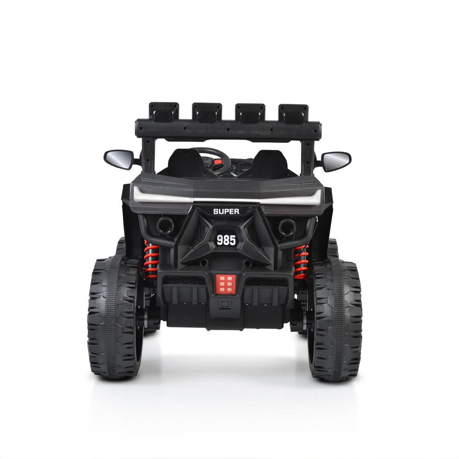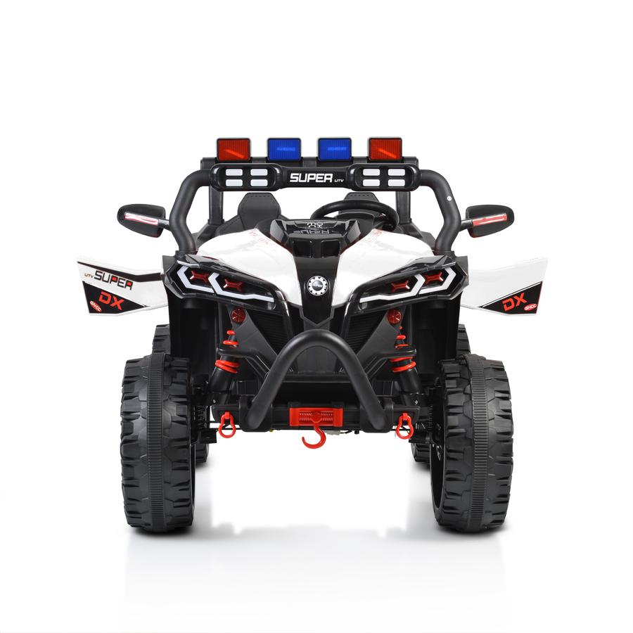 За деца над 37 месеца с тегло до 30 кг. Батерия - 1*12V/7Ah; Четири мотора; Пластмасови гуми; Функция люлеене; 2.4G Дистанционно Управление; Предни светлини; ON/ OFF бутон; Музикален плейър с USB, MP3 извод, Музикални функции; 2 скорости - висока и ниска - контролират се само от Дистанционното Управление; Предпазен колан; Отварящи се врати;