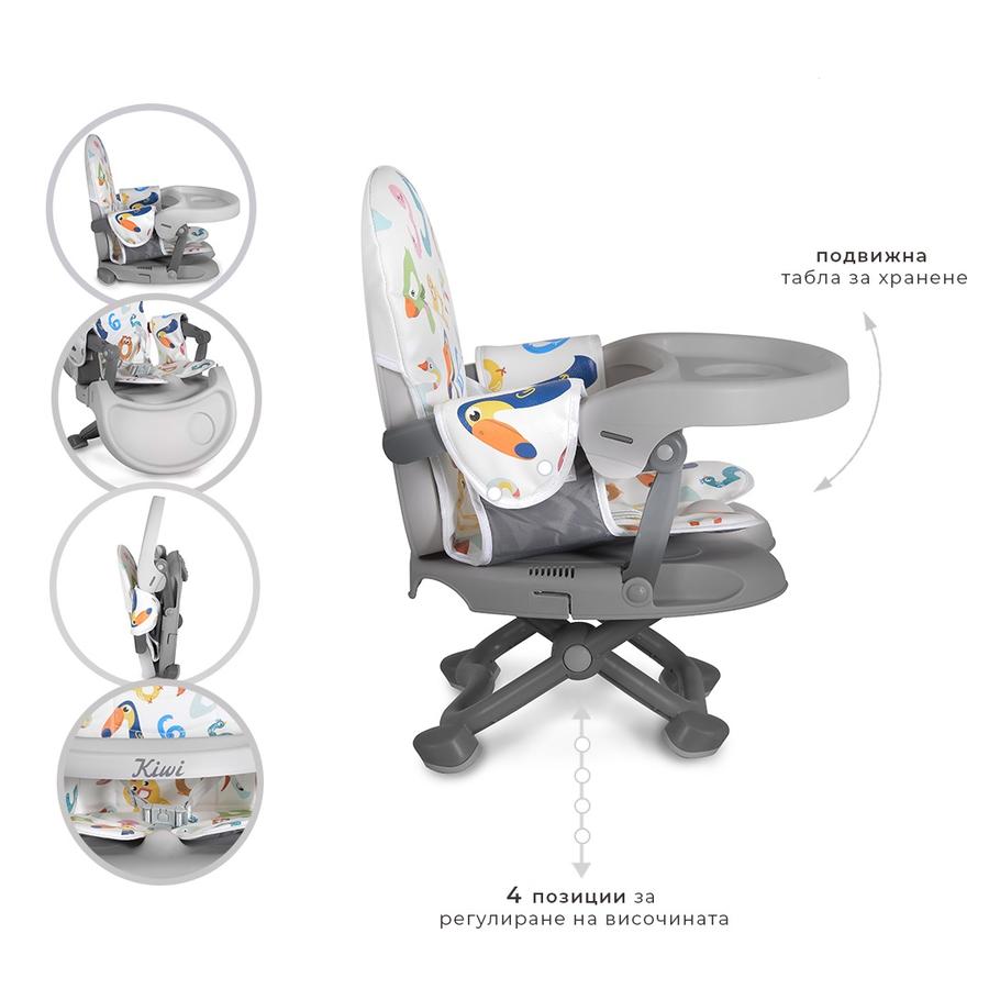 Повдигащият стол за хранене Kiwi е предназначен за деца, които могат да седят самостоятелно приблизително на възраст над 6 месеца и с тегло до 15 кг (около 3-годишно дете).
