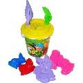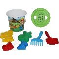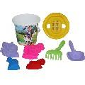 Плажен комплект 8 елемента. Включва 1 бр. декорирана плажна кофичка, 1 бр. сито, 1 бр. гребло, 1 бр. лопатка, 4 бр. пясъчни формички.