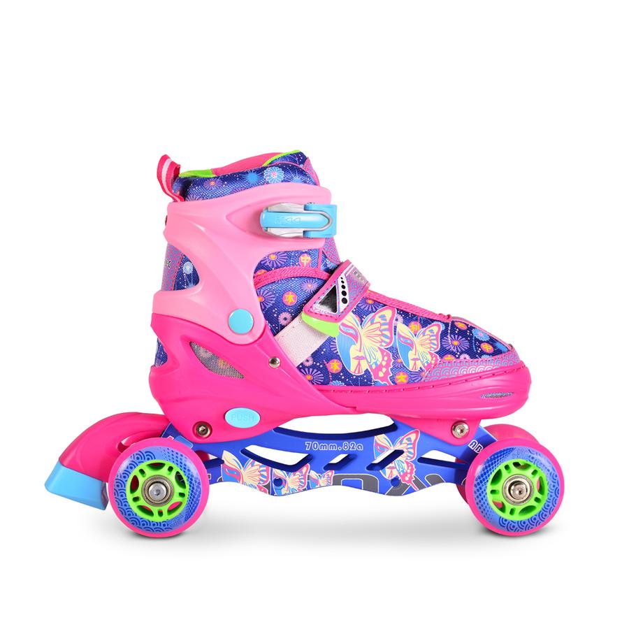 Регулируемите ролери са подходящи за деца на възраст над 3 години и тегло до 60 кг. Тези детски ролери имат 4 PU колела с размер 70х24мм +64*24мм с лагери ABEC-7, от които предното е светещо. Този модел е снабден със система за регулиране на размера на четири етапа: размер L от 38 до 41, М от 34 до 37 и S от 30 до 33 номер обувка. Ролерите са с лека алуминиева основа и спирачка. Закопчаването е с Velcro лента и двойно подсигурена катарама.