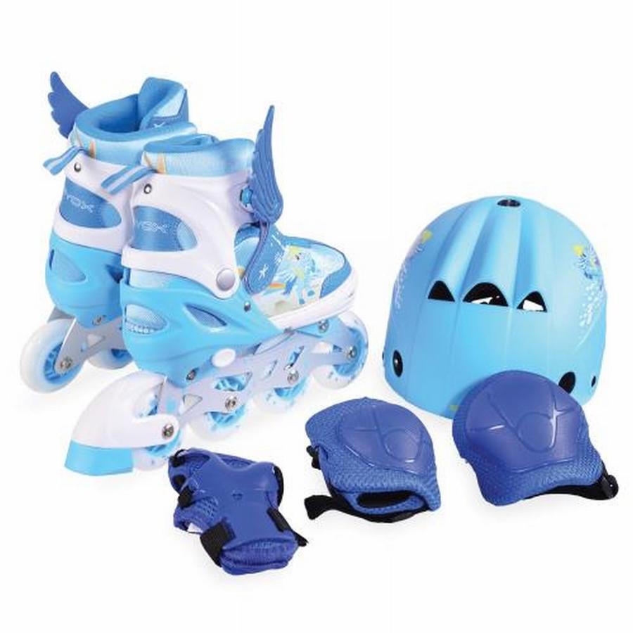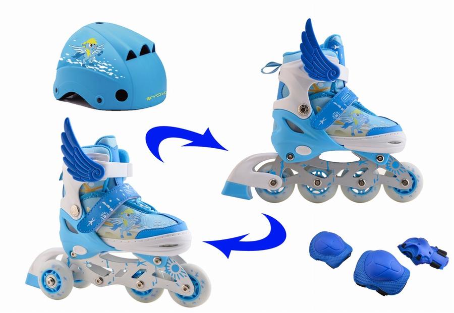 Ролери 2 в1 са подходящи за деца на възраст над 3 години и тегло до 50 кг. Тези детски ролери имат 4 PU колела(предното е светещо) с размери 70х24мм с лагери ABEC-7, които имат възможност за поставяне в две положения: *4те колела в една редица като ролери и *2 колела отзад и 2 в редица отпред . Така детето ще има стабилност по време на пързаляне, а когато порасне колелата могат да се монтират в една редица.Този модел е снабден със система за регулиране на размера на четири етапа: от 30 до 33 номер обуква за размер S; от 34 до 37 за размер M.Ролерите са с лека алумииева основа и спирачка. Закопчаването е с връзки, Velcro лента и двойно подсигурена катарама.В комплекта има каска и протектори.