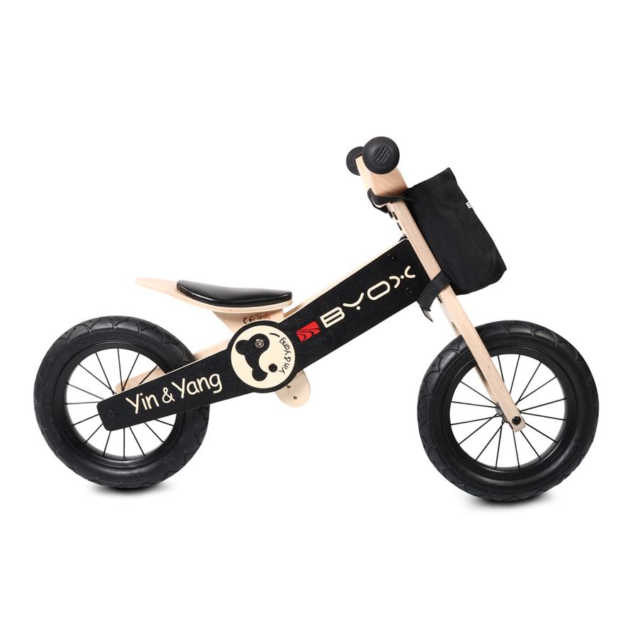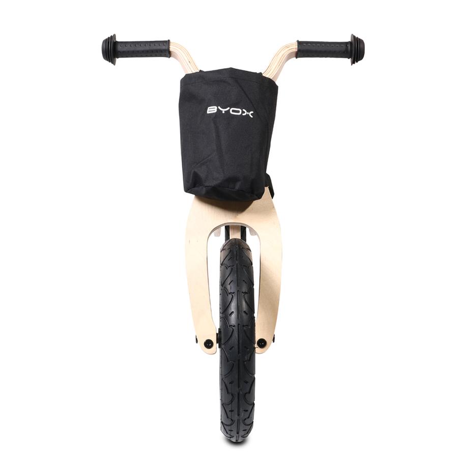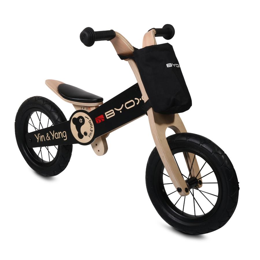 Подходящо за деца на възраст 3-6 години; Рамката е изработена от естествен дървени материали - брезова дървесина ; Оцветени с нетоксични водни лакове; Удобни ТРЕ ръкохватки с ограничител; Специални непомпащи гумени колела 12``; пластмасова главина, 6001ZZ лагери, в комплекта e включенa предна чанта за играчки; мека PU седалка с възможност за регулиране на височината.