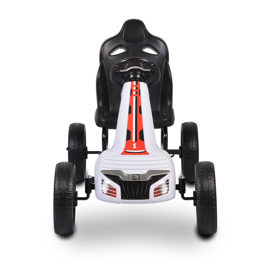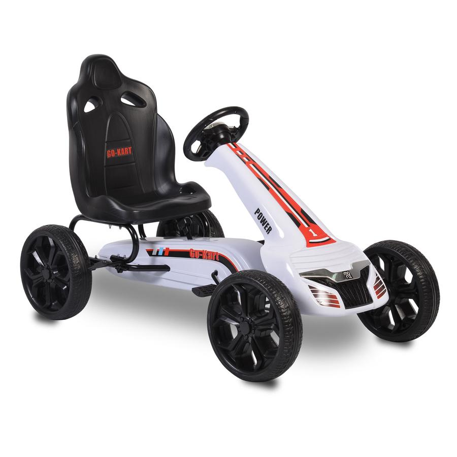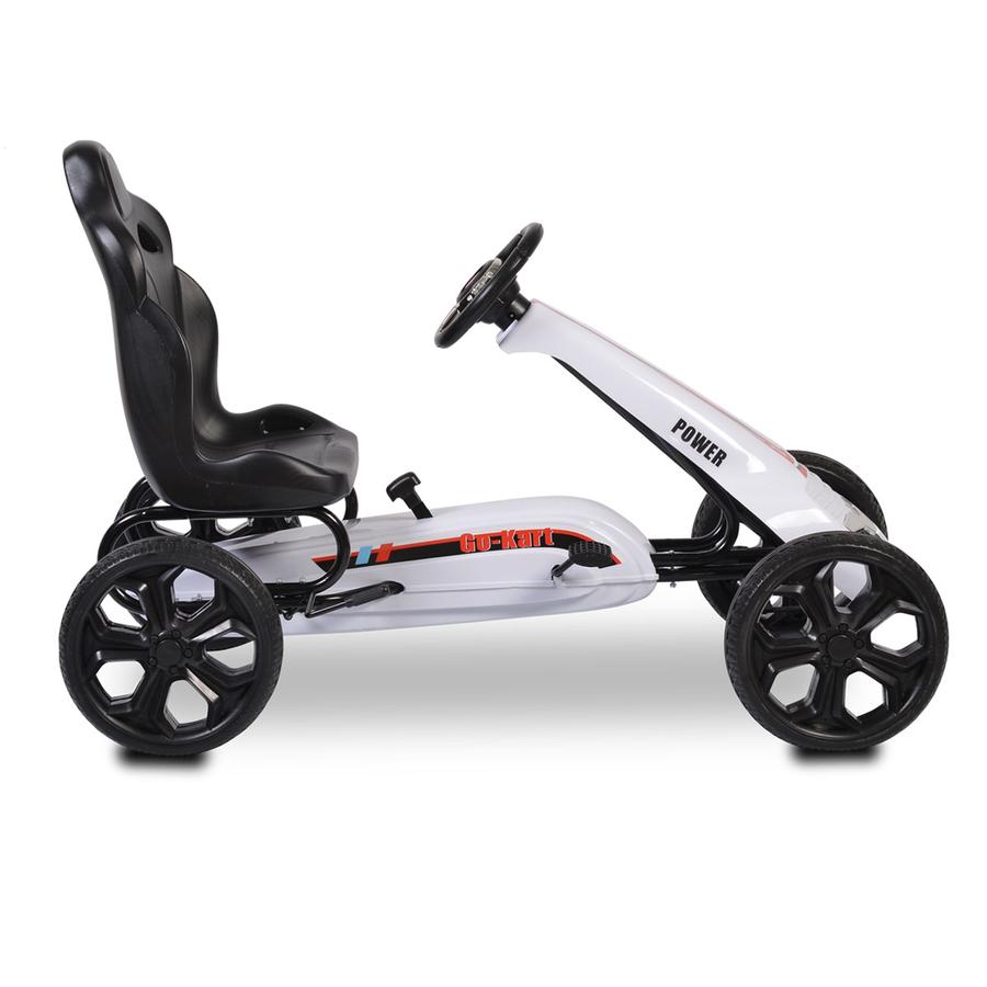 За деца на възраст от 37 до 95 месеца с максимално тегло до 40 кг. С меки синтетични EVA гуми. Движи се напред и назад чрез педалите; спиране чрез ръчната спирачка, разположена над дясната задна гума; лост за свободно движение. Размер на продукта: 113 x 58 x 72 cm.