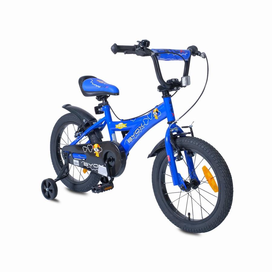 Детски велосипед 16“ с метална рамка. Алуминиеви капли. Алуминиев държач за кормило. Предна и задна V-brake спирачки. Пластмасови калници и предпазител за верига. Помощни колела. Звънец . Подходящо за деца от 4 до 6 годишна възраст , с максимално тегло до 30 kg