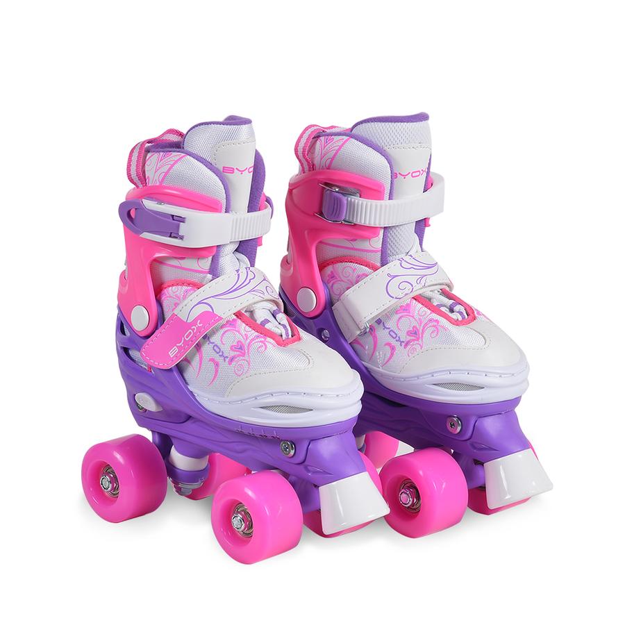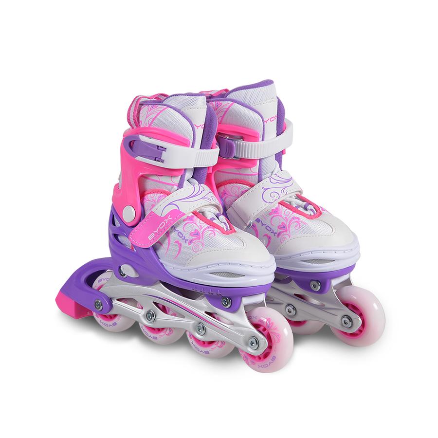 Регулируеми ролери и кънки 2в1 за регулиране с бутон в 4 размера според големината на крака; двойно осигурена катарама; лагери ABEC-5; горна мека част с принт; PU LED колела за ролерите с алуминиево шаси : 64*24мм за размер 30-34 ; 70*24мм за размер 34-37; PU LED колела 54*32мм за тип кънки с PP шаси ; PVC спирачка