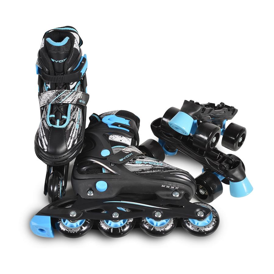 Регулируеми ролери и кънки 2в1 за регулиране с бутон в 4 размера според големината на крака; двойно осигурена катарама; лагери ABEC-5; горна мека част с принт; PU LED колела за ролерите с алуминиево шаси : 64*24мм за размер 30-34 ; 70*24мм за размер 34-37; PU LED колела 54*32мм за тип кънки с PP шаси ; PVC спирачка