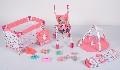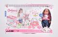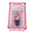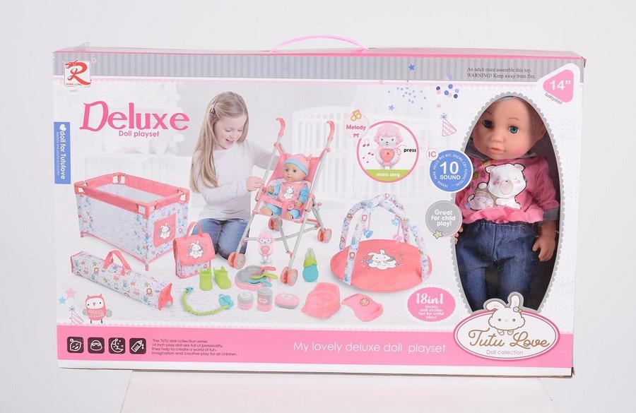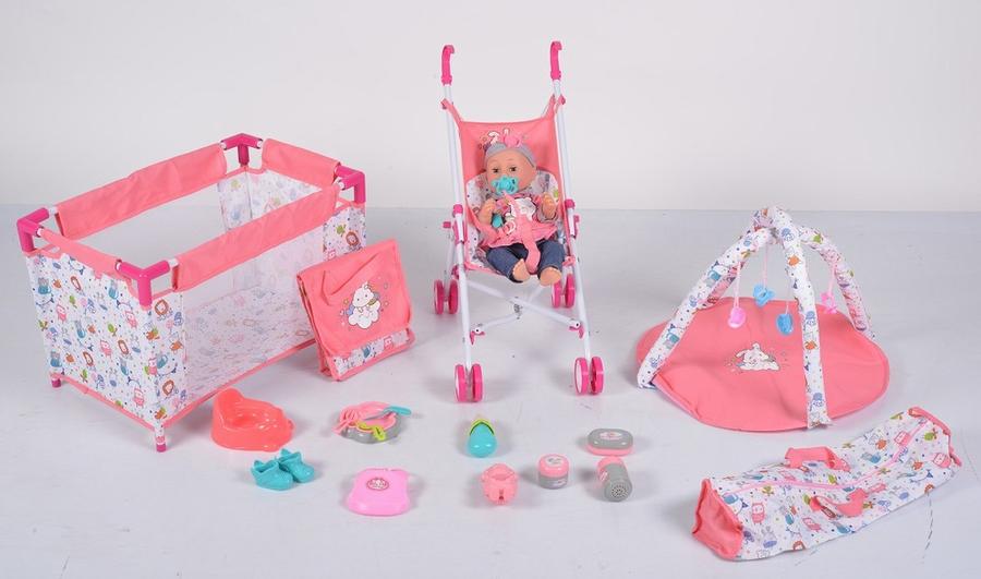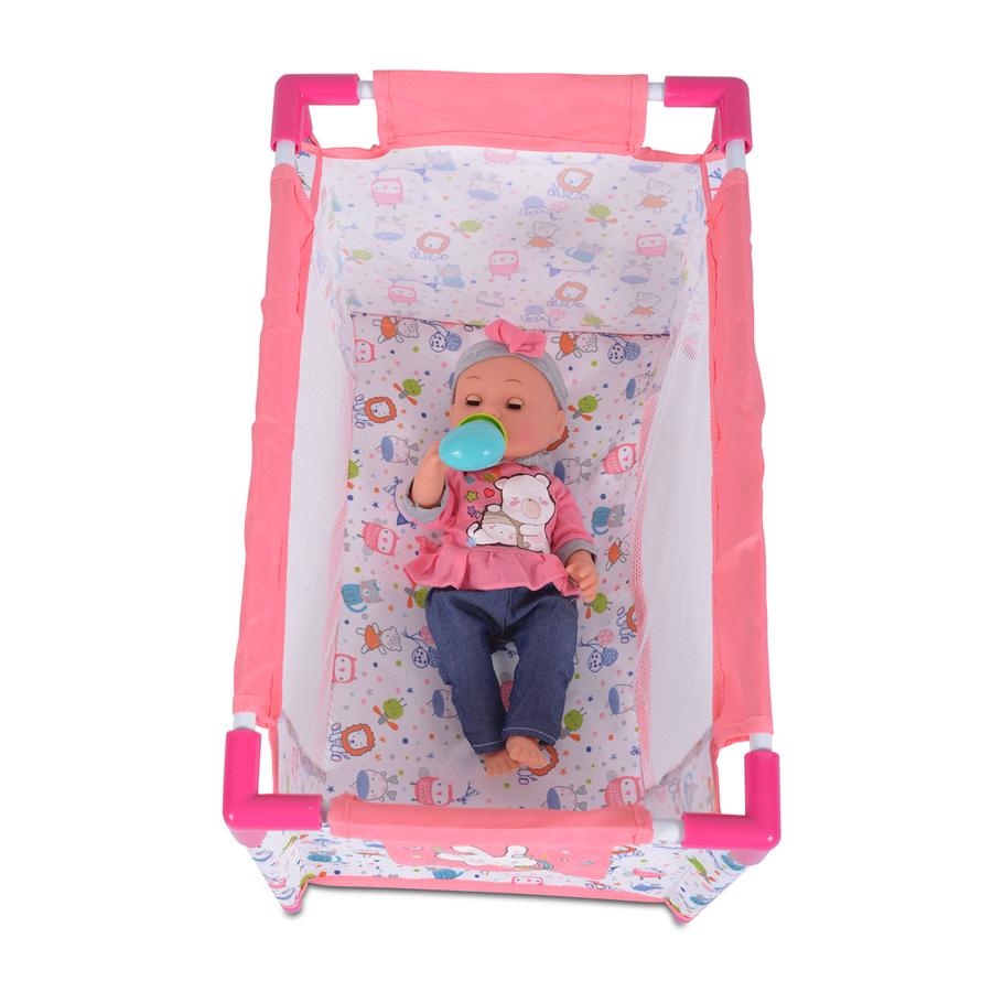 36 см. Кукла в комплект с кошара и количка за кукли. В комплекта има музикална играчка. Включеното шише е играчка и не е подходящо за бебета или деца. Продуктът е предназначен за деца на възраст над 3 години.
