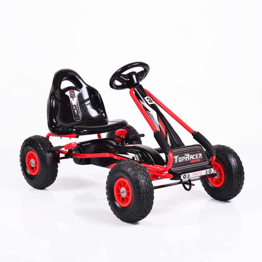 Този продукт представлява картинг кола с педали, подходяща за деца на възраст над 3 години с максимално тегло до 25 кг. Колата се движи напред и назад чрез педалите и може да се спре чрез ръчната спирачка, разположена над дясната задна гума. Картингът е с големи надуваеми гуми, допринасящи за по - меко возене, и удобна и широка седалка. Продуктът е със следните рамери: 97*69*60 cm.