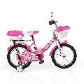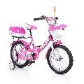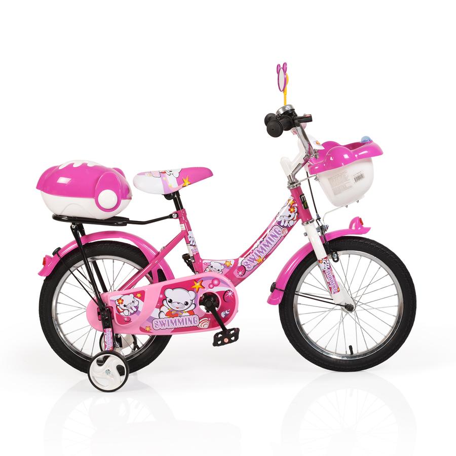 Детски велосипед 16“ с метална рамка. Предна спирачка и контра. Метални капли. Пластмасов кош и багажник. Пластмасови калници. Помощни колела Огледало и звънец. За деца на възраст от 4 до 6 години, с максимално тегло до 30 кг