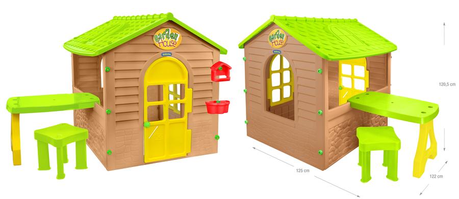 Забавна детска къща с маса и стол. Вратата и прозореца на къщичката могат да се отварят и затварят. Комплекта включва столче и маса, която се монтира на една от страните на къщата, а също и хранилка за птици. Изработена от бои и материали безопасни за здравето на Вашето дете. Подходяща за деца над 12 месечна възраст.
