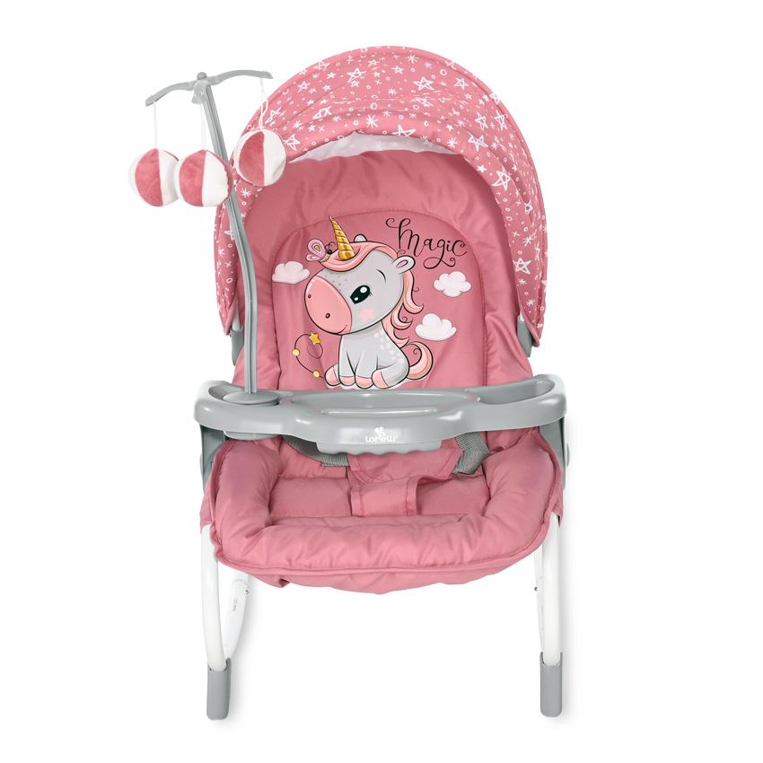 Идеално решение и за най-слънчевите летни дни, шезлонгът разполага със сгъваем сенник и поставка за предмети. Настроението на детето е гарантирано от специалния гриф с играчки, осигуряващи постоянно занимание. При нужда от почивка и дрямка, облегалката може да промени позицията си, а люлеещият се механизъм допълнително примамва в страната на сънищата. Шезлонгът е компактен и лесно преносим, а безопасността на детето е гарантирана от възможността за заключване на люлеенето.