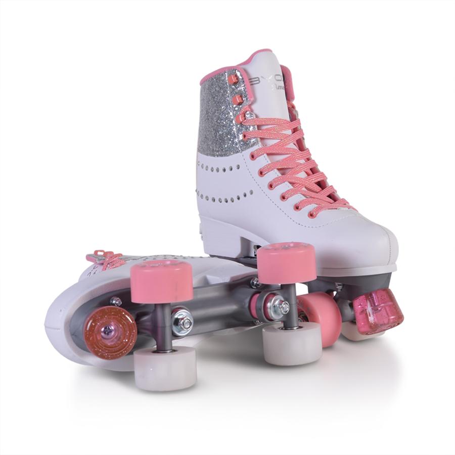 Регулируеми кънки с PU колелца размер 54*32мм- страничните бели са светещи ; лагери ABEC-7; PU спирачка с брокат; PP основа и носачи; Външен материал PVC кожа и светеща буква на глезена и декоратични камъчета; връзки с брокат; Раница за носене на кънките