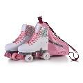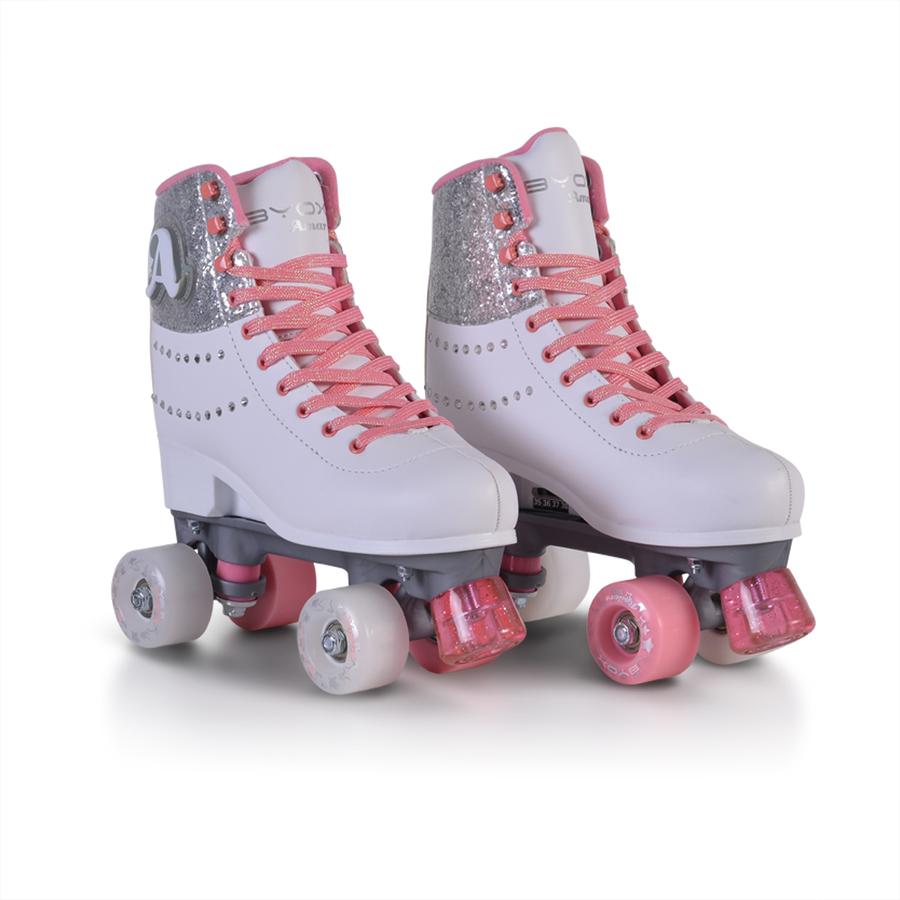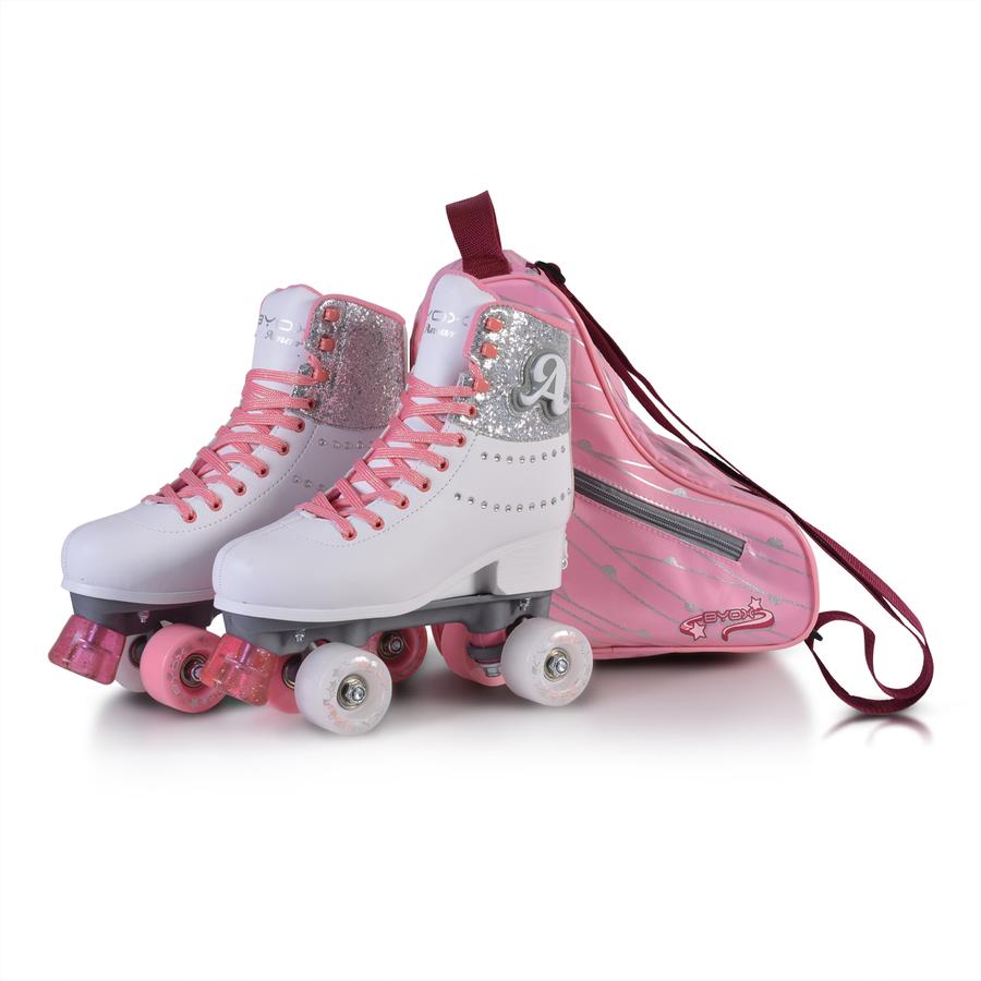 Регулируеми кънки с PU колелца размер 54*32мм- страничните бели са светещи ; лагери ABEC-7; PU спирачка с брокат; PP основа и носачи; Външен материал PVC кожа и светеща буква на глезена и декоратични камъчета; връзки с брокат; Раница за носене на кънките