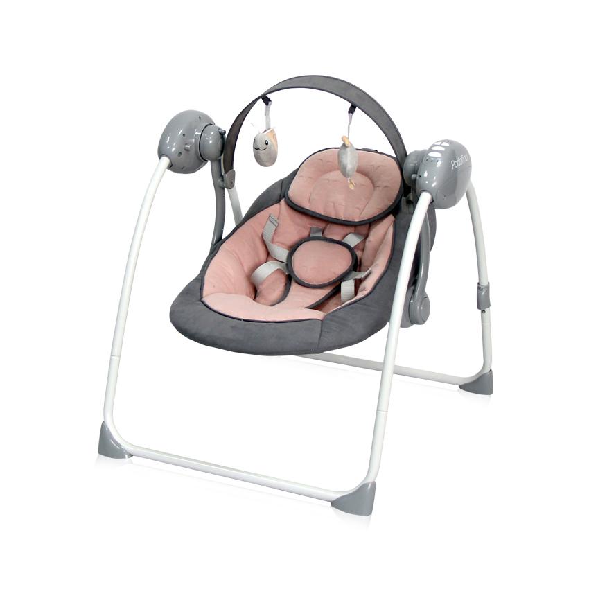 Тих режим на люлеене, позволяващ по-бързото заспиване на детето.,Сгъва се до компактни размери за лесно нонесе и съхранение.,Музикален панел с 12 мелодии и възможност за регулиране силата на звука,Таймер с интервали от 8, 15 и 30 минути,5 скорости на люлеене,Регулируем 5-точков колан,Гриф с 2 плюшени играчки,Захранва се с 4 броя батерии /не са включени в комплекта/,Адаптер, включен в комплекта,Отстраняема подложка за глава, осигуряваща oпора и максимален комфорт за Вашето дете.