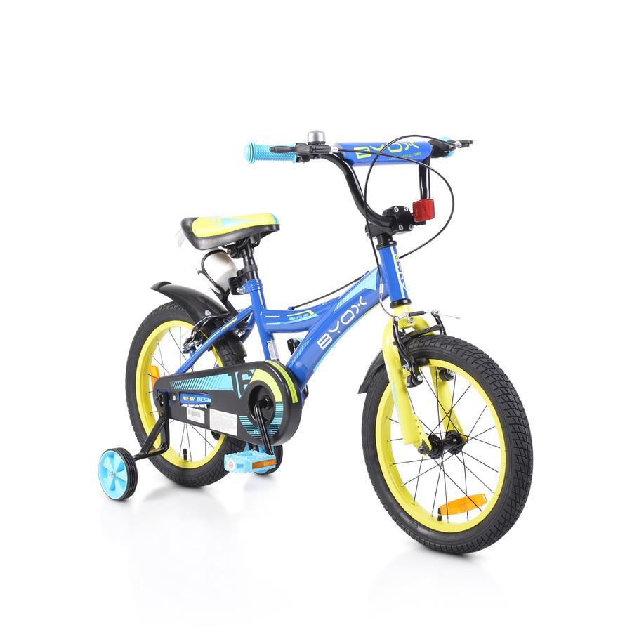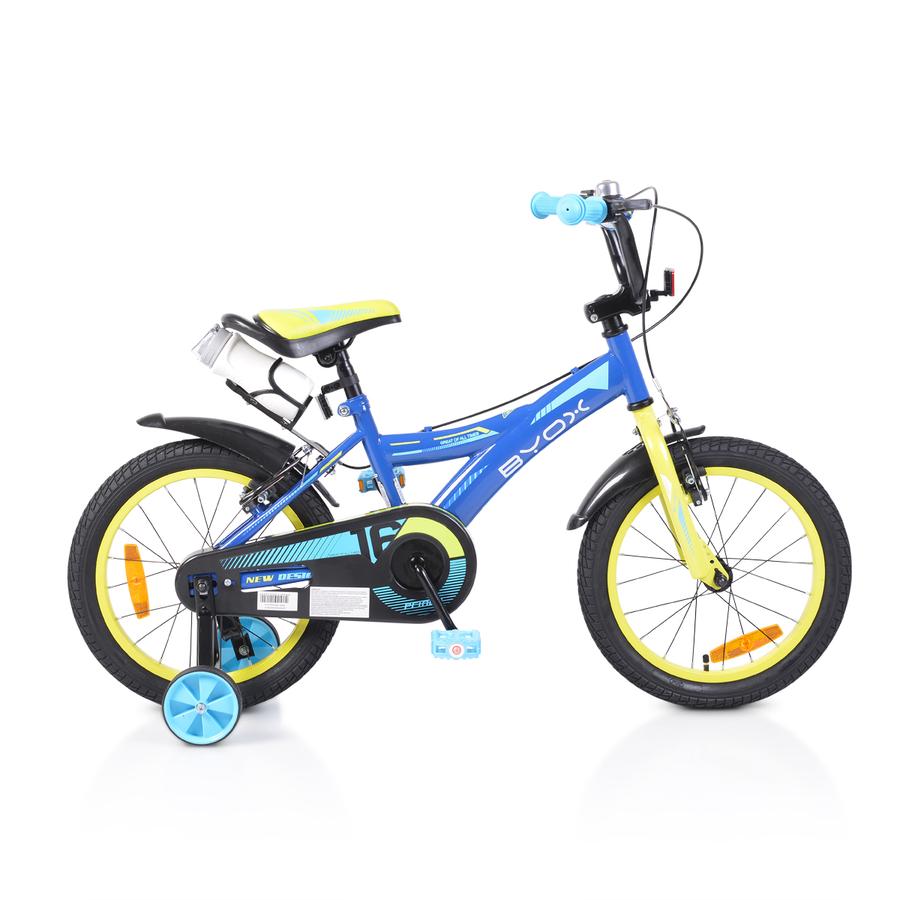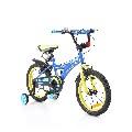 Детски велосипед 16“ с метална рамка. Алуминиеви капли. Алуминиев държач за кормило. Предна и задна V-brake спирачки. Пластмасови калници и предпазител за верига. Помощни колела. Звънец . Подходящо за деца от 4 до 6 годишна възраст , с максимално тегло до 30 kg