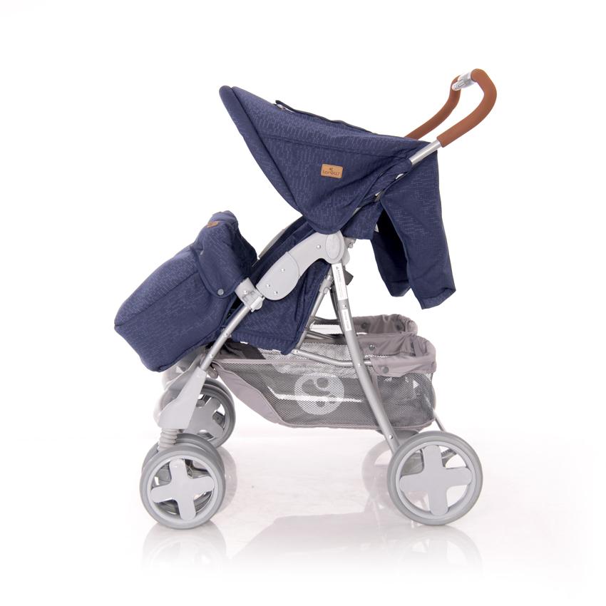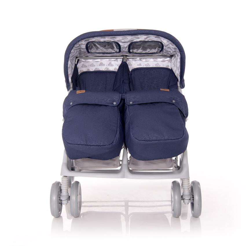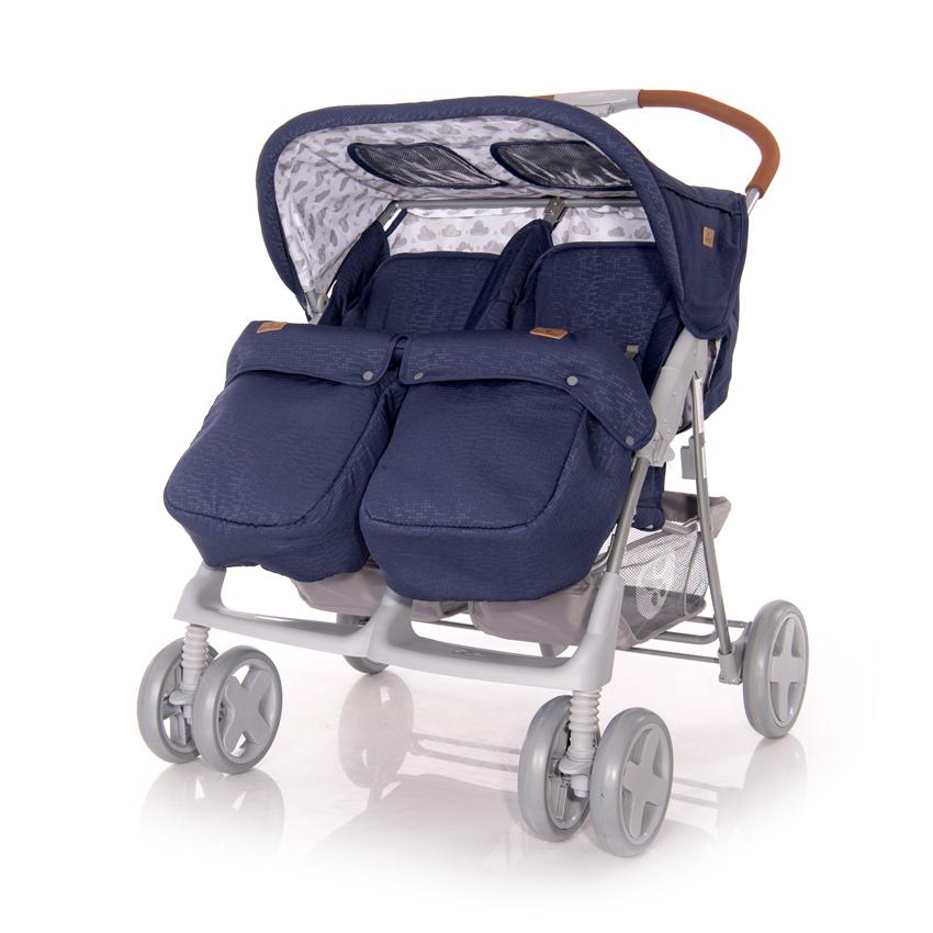 сгъваем сенник,сгъване с една ръка,5 точкови предпазни колани,завиващи предни колела,сгъваема до компактни размери,индивидуално регулируеми облегалки и подложки за крачета до легнало положение,грифове,прозорчета на сенника,големи кошове за пазаруване,индивидуални покривала за крачета,чанта за аксесоари с подложка за повиванеРадостта от близнаците е двойна, такава е и количката за тях. Колкото и да са еднакви двете човечета обаче, всяко от тях разбира комфорта по различен начин, за това и седалките на количката са напълно самостоятелни една от друга, както и различните положения, които може да постигнете с всяка от тях. Количката е подходяща и за летен, и за зимен сезон, а най-голямото й предимство е , че може да се сгъне само с една ръка и без много усилия. Кошът за пазаруване също е двоен, а ако и това не ви е достатъчно може да ползвате чантата за аксесоари. Количката се предлага в няколко цвята. Конструкцията й може да понесе двойна тежест до 25 кг.