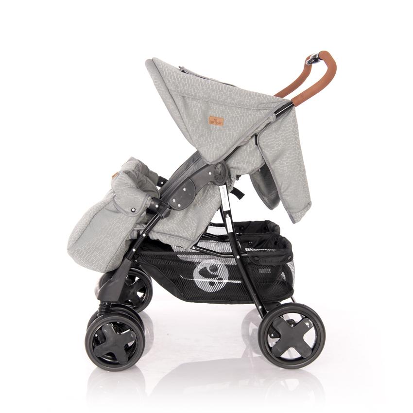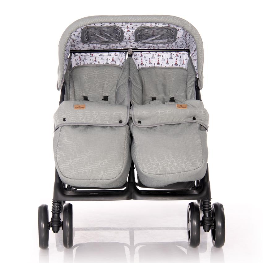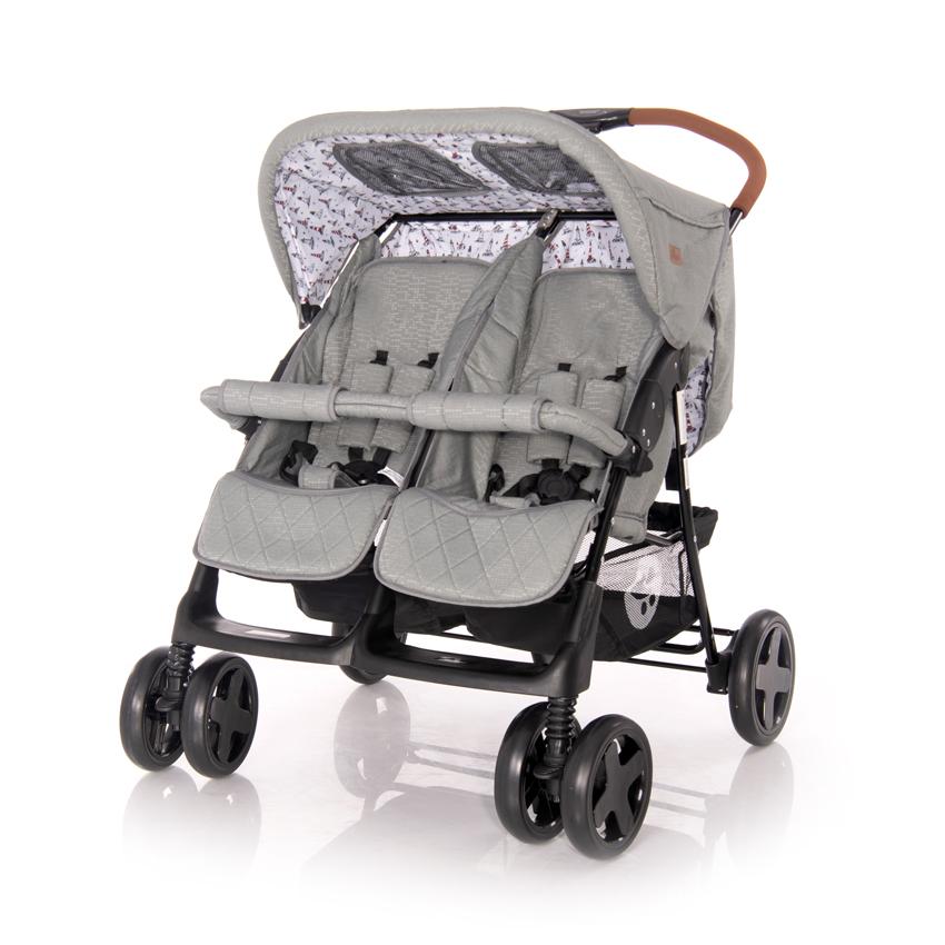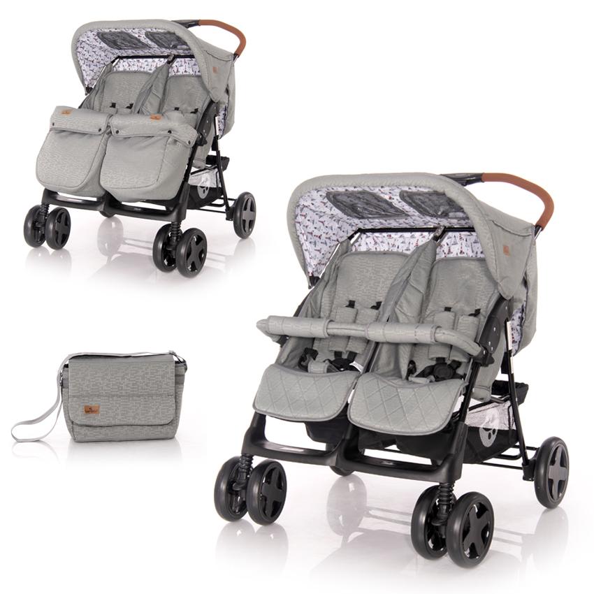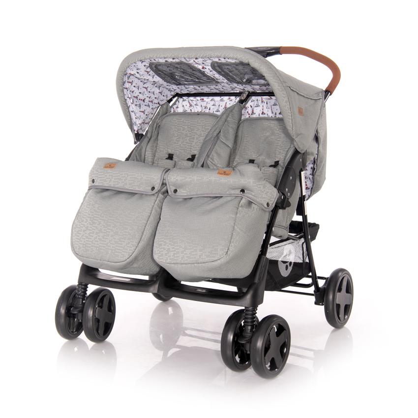 сгъваем сенник,сгъване с една ръка,5 точкови предпазни колани,завиващи предни колела,сгъваема до компактни размери,индивидуално регулируеми облегалки и подложки за крачета до легнало положение,грифове,прозорчета на сенника,големи кошове за пазаруване,индивидуални покривала за крачета,чанта за аксесоари с подложка за повиванеРадостта от близнаците е двойна, такава е и количката за тях. Колкото и да са еднакви двете човечета обаче, всяко от тях разбира комфорта по различен начин, за това и седалките на количката са напълно самостоятелни една от друга, както и различните положения, които може да постигнете с всяка от тях. Количката е подходяща и за летен, и за зимен сезон, а най-голямото й предимство е , че може да се сгъне само с една ръка и без много усилия. Кошът за пазаруване също е двоен, а ако и това не ви е достатъчно може да ползвате чантата за аксесоари. Количката се предлага в няколко цвята. Конструкцията й може да понесе двойна тежест до 25 кг.