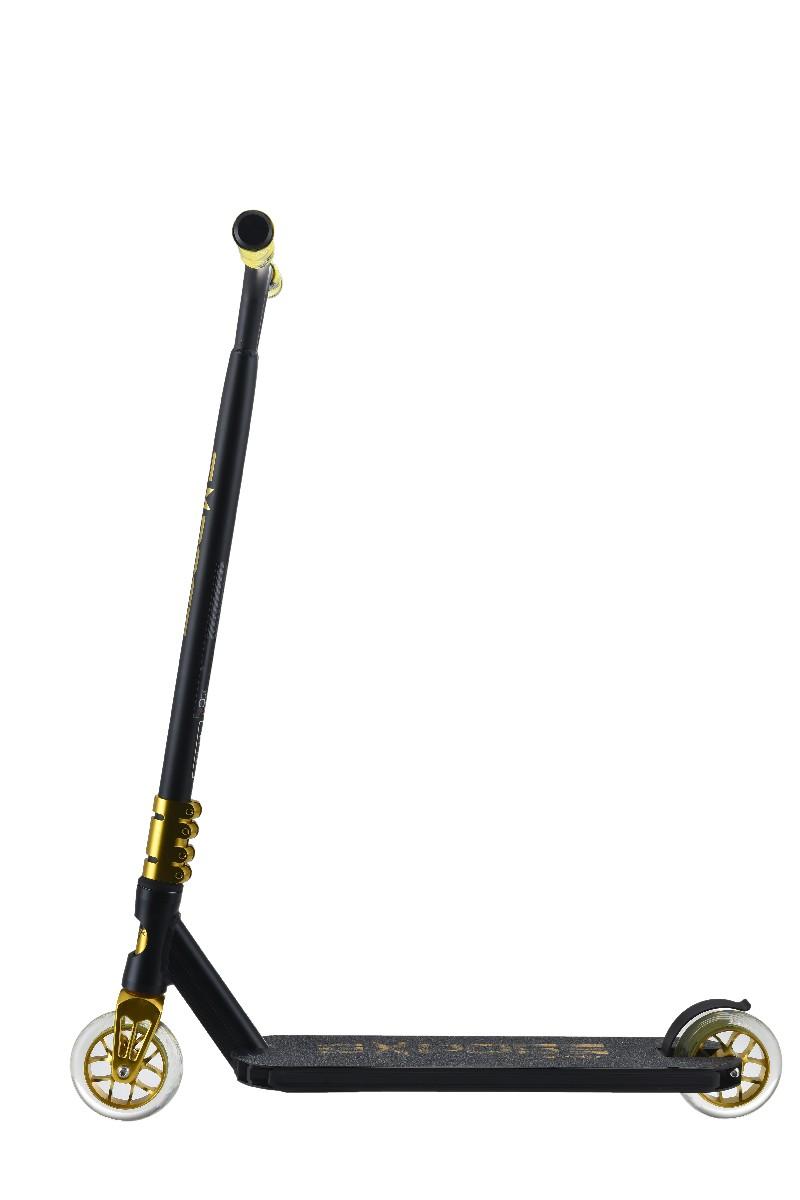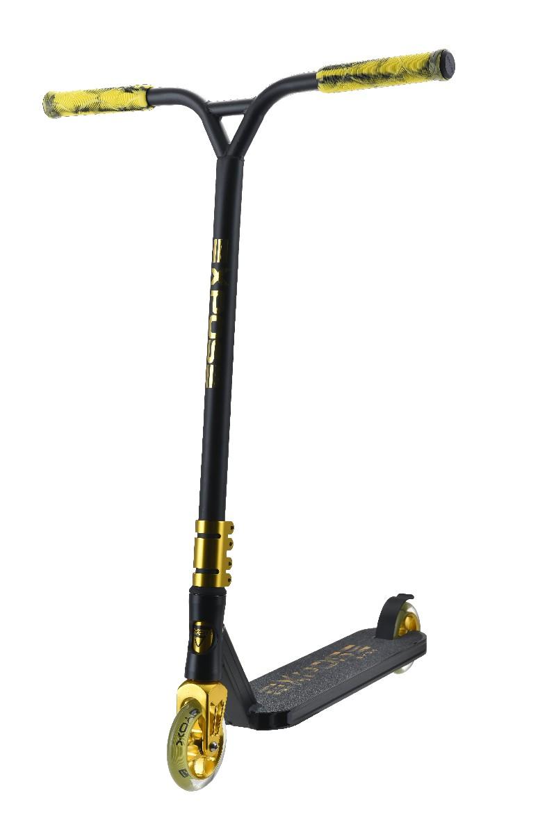 Алуминиева тротинетка с HIC система, PU прозрачни колела 110mm алуминиеви; лагери ABEC-9; Aлуминиева вилка, Стягаща скоба с четири болта ; Метално кормило дължина 570mm с двуцветни TPR ръковхатки 160mm; височина от земята 850mm; закръглена основа с водоустойчива противохлъзгаща шкурка и една допълнително подарък; размер на алумуниевата основа 490mm/ 110mm; за възраст 10+ и максимално натоварване до 100кг