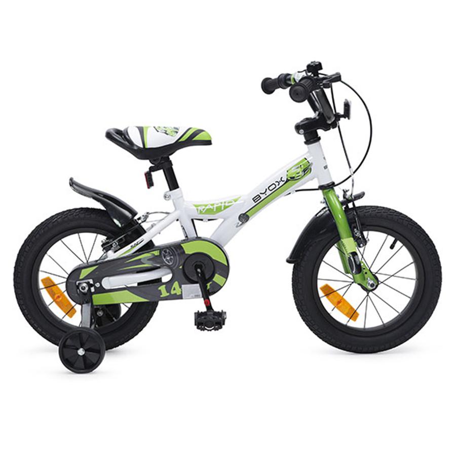 Детски велосипед 14“ с метална рамка. Алуминиеви капли. Алуминиев държач за кормило. Предна и задна V-brake спирачки. Пластмасови калници и предпазител за верига. Звънец. Помощни колела. Подходящ за деца от 4 до 5 годишна възраст , с максимално тегло до 25 kg