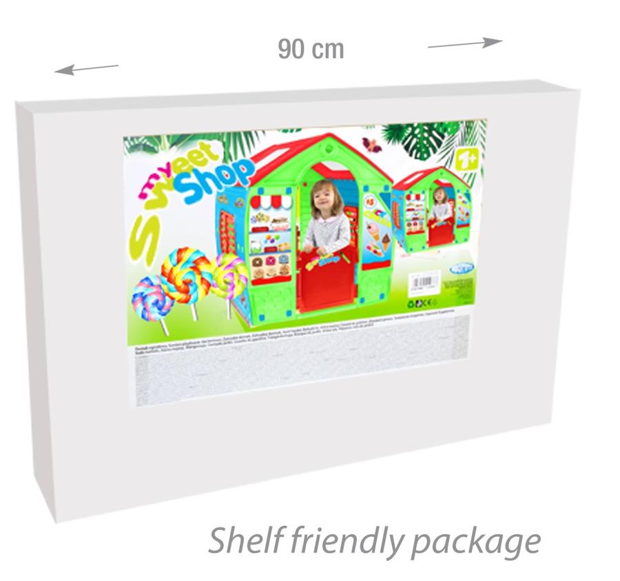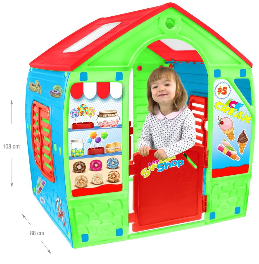 Mochtoys My Sweet Shop детска градинска къща с цветни стикери имитиращи сладкарница. Отварящи се врати и прозорци. Пъстър дизайн. Комплекта включва четири броя имитация на фунийки за сладолед + сладолед. Изработена от бои и материали безопасни за здравето на Вашето дете. Подходяща за деца над 12 месечна възраст.