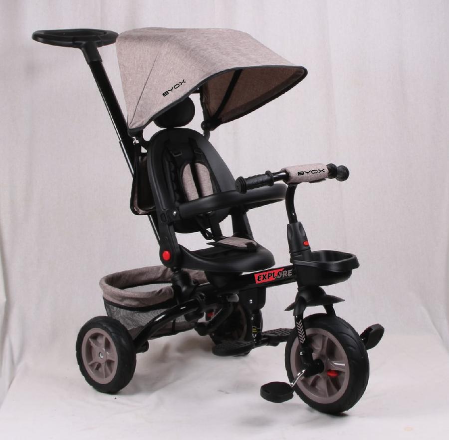 За деца от 12 до 60 месеца с максимално тегло до 25 кг. Може да се използва и без дръжката за родителски контрол, сенника и предпазния борд. Сгъваема задна рамка; Седалка: въртяща се на 360°; регулируема облегалка за гръбчето. Дръжка - регулируема, насочваща посоката на движение на предното колело. Гуми: каучук ненадуваем. Предно колело с бутон за свободно движение. Сваляем предпазен борд. 3-точкови предпазни колани. Две задни спирачки. Задна и предна кошничка за играчки и чанта за аксесоари.