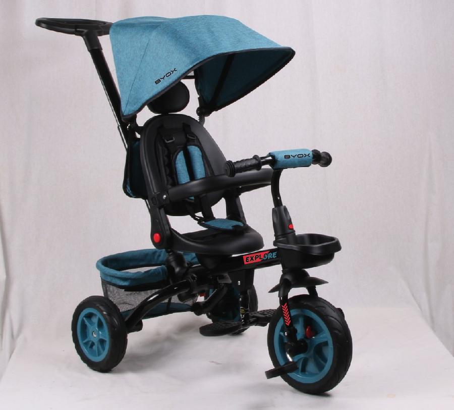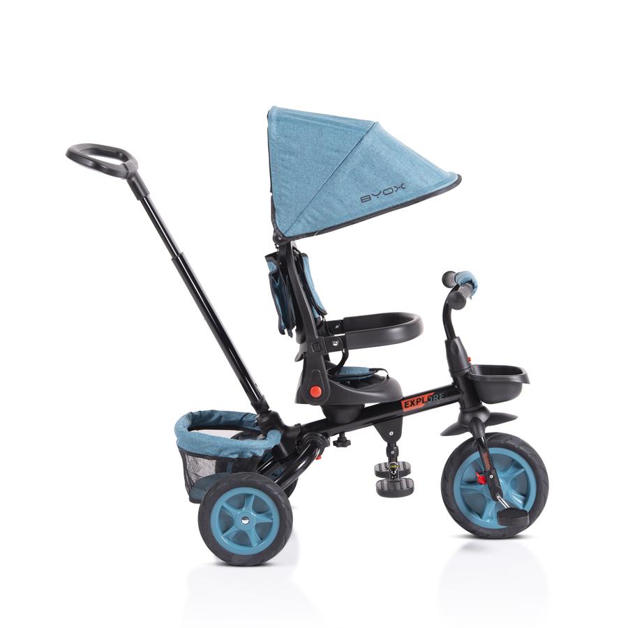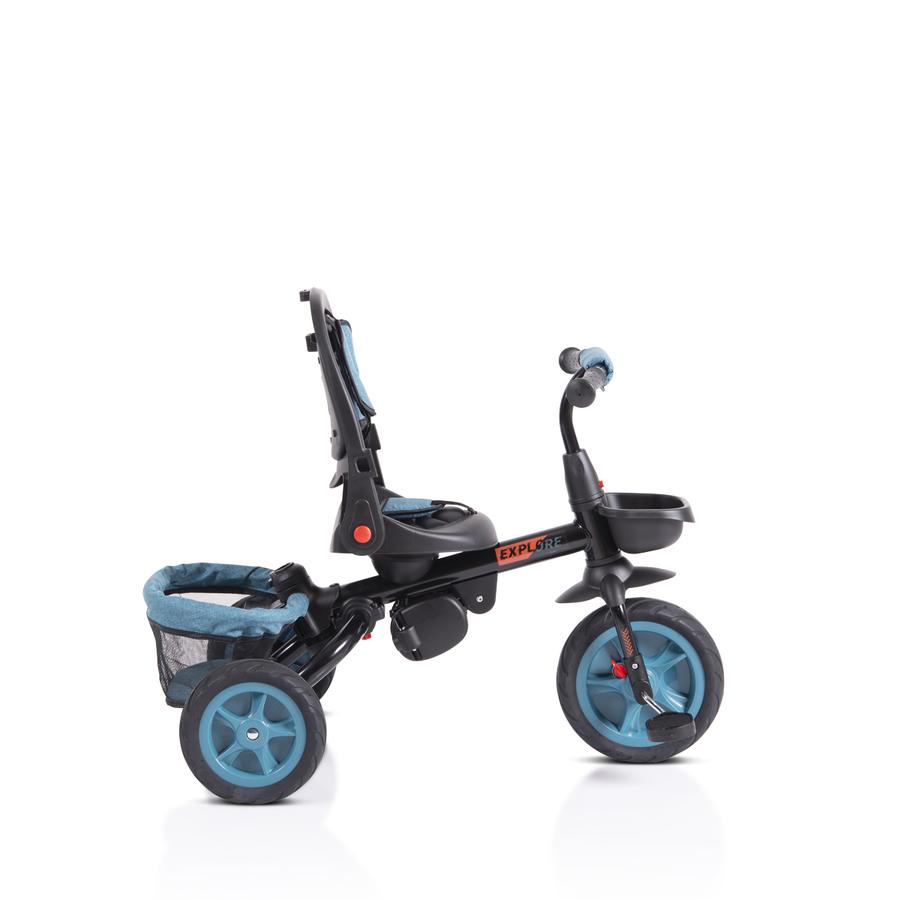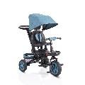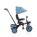 За деца от 12 до 60 месеца с максимално тегло до 25 кг. Може да се използва и без дръжката за родителски контрол, сенника и предпазния борд. Сгъваема задна рамка; Седалка: въртяща се на 360°; регулируема облегалка за гръбчето. Дръжка - регулируема, насочваща посоката на движение на предното колело. Гуми: каучук ненадуваем. Предно колело с бутон за свободно движение. Сваляем предпазен борд. 3-точкови предпазни колани. Две задни спирачки. Задна и предна кошничка за играчки и чанта за аксесоари.