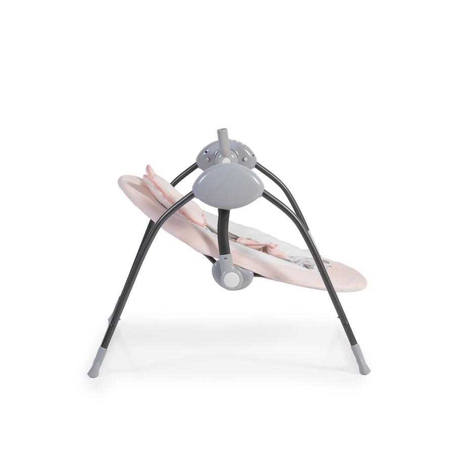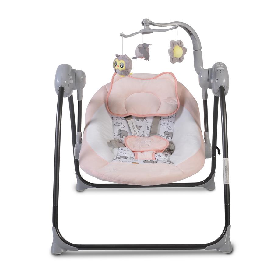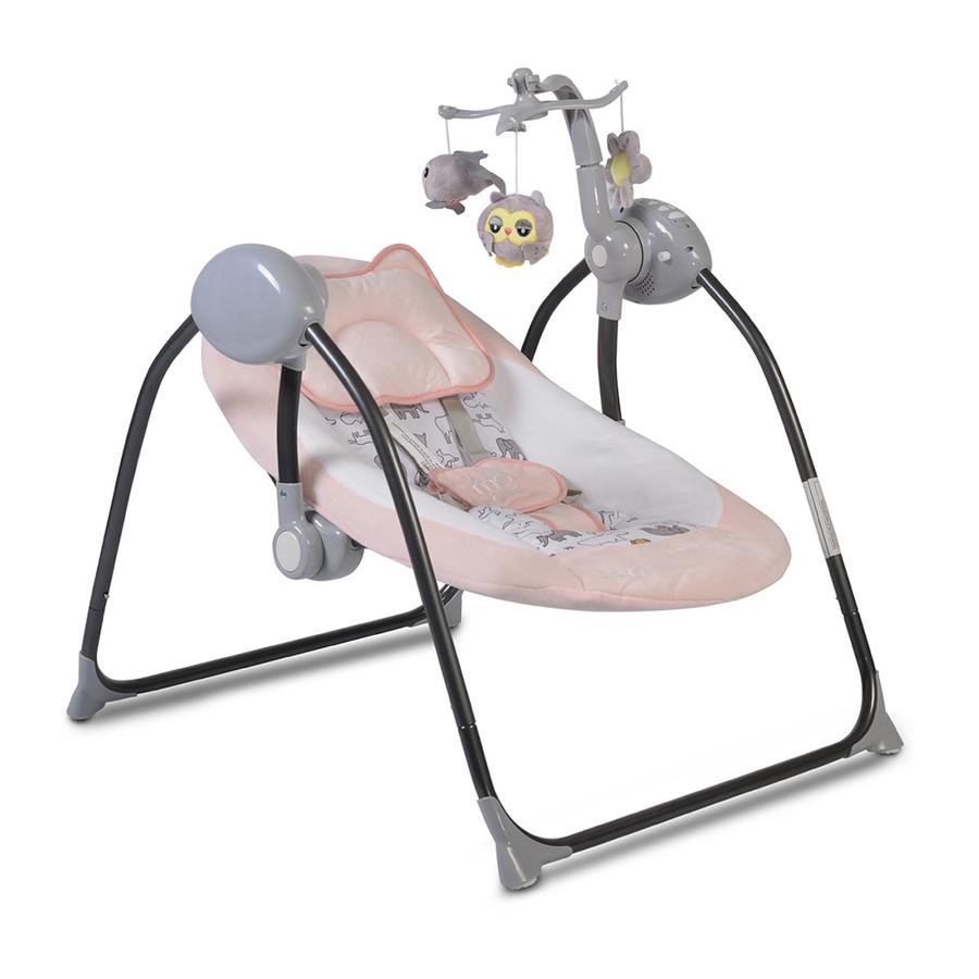 Електрическата люлка има 5 скорости на люлеене, които са обозначени със светещи индикатори. Благодарение на 12 приятни мелодии и меки, цветни играчки (бухал, рибка, цвете), Вашето бебе ще се забавлява от сърце. Седалката има две позиции на гръбчето - легнала за почивка и полуизправена за игра.