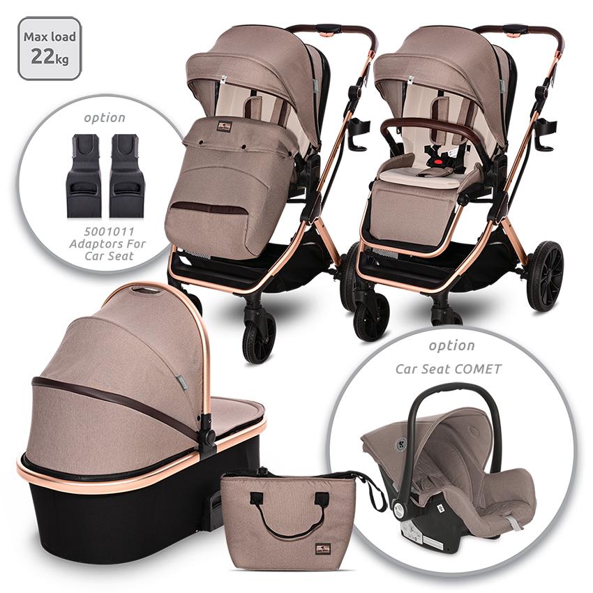 кош за новородено,подвижна поставка за крачета,амортисьори на задните колела,реверсивна седалка,поставка за аксесоари на дръжката,сгъване с една ръка,сгъваем сенник с допълнителна секция и козирка,чанта за аксесоари,прозорче с капаче на сенника,мека подложка за тялото,голям кош за пазаруване,завиващи предни колела с възможност за застопоряване,регулируем гръб - 3 позиции,покривало,алуминиева рама,5-точков предпазен колан,гриф: ЕКО кожа,дръжка: ЕКО кожа,*опция за монтаж на столче за кола COMET чрез адаптори 5001011 /адапторите не са включени в комплекта/,Столче за кола COMET */опция/