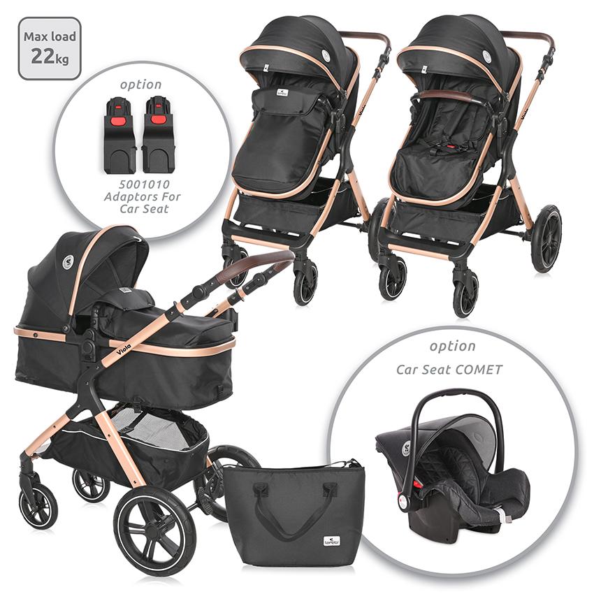 чанта за аксесоари,сгъваем сенник с козирка,поставка за аксесоари на дръжката,отстраняем гриф,столче за кола /опция/,завиващи предни колела,кош за новородено, трансформиращ се в седалка,мека подложка за тялото,спирачка на задните колела,покривало,реверсивна седалка,регулиране на дръжката,5-точков предпазен колан,голям кош за пазаруване,гриф: ЕКО кожа,дръжка: ЕКО кожа,сгъваема до компактни размери заедно с трансформиращия се кош,*опция за монтаж на столче за кола COMET чрез адаптори 5001010 /адапторите не са включени в комплекта/