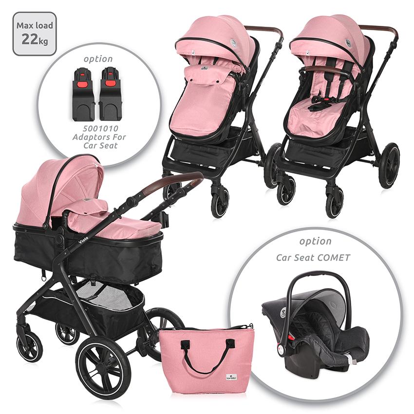 чанта за аксесоари,сгъваем сенник с козирка,поставка за аксесоари на дръжката,отстраняем гриф,столче за кола /опция/,завиващи предни колела,кош за новородено, трансформиращ се в седалка,мека подложка за тялото,спирачка на задните колела,покривало,реверсивна седалка,регулиране на дръжката,5-точков предпазен колан,голям кош за пазаруване,гриф: ЕКО кожа,дръжка: ЕКО кожа,сгъваема до компактни размери заедно с трансформиращия се кош,*опция за монтаж на столче за кола COMET чрез адаптори 5001010 /адапторите не са включени в комплекта/