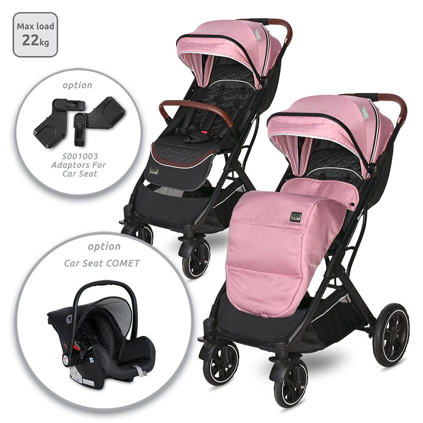завиващи предни колела,спирачка на задните колела,висококачествени PU гуми,покривало,сгъваем сенник с допълнителна мрежеста секция,прозорче на сенника,регулируема облегалка,5-точков предпазен колан,голям кош за пазаруване,сгъваема до компактни размери,гриф: ЕКО кожа,дръжка: ЕКО кожа,*опция за монтаж на столче за кола COMET чрез адаптори 5001003 /адапторите не са включени в комплекта/