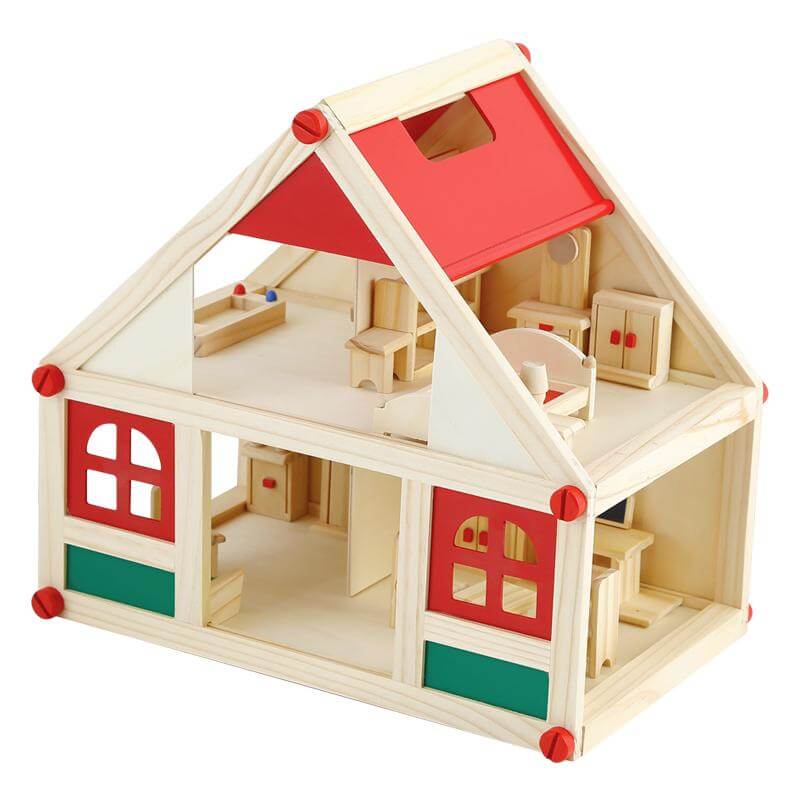 Дървена вила за кукли с всички необходими мебели.Просторна и уютна, тази къща ще е прекрасен дом на дървените кукли на всяко дете. Четирите стаи притежават цялото нужно обзавеждане за да може кукленското семейство да заживее спокойно и да позволи на детето да развихри въображението си.Размери на сглобената къща: 39х26х36см.Размери на опаковката: 40х38х8,5см.Тегло: 2.8кг.Подходящо за деца над 3 години.