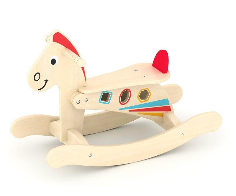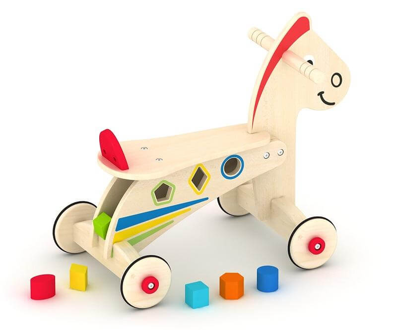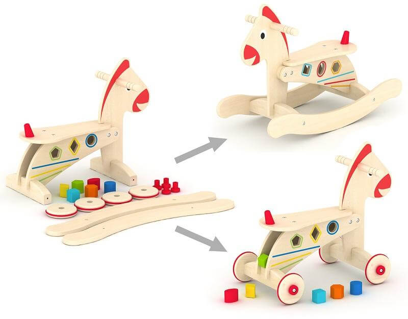 Този продукт, може да се модифицира от детск люлеещо се конче в конче за бутане с колелца. По този начин децата първо биха могли да открият удоволствието от люлеенето и след това, когато крачетата им укрепнат още повече, да се избутват и "яздят" дървеното конче вкъщи или навън.Размери на кончето: 66х31х47см, тегло: 6кг.Подходящо за деца над 2 години.
