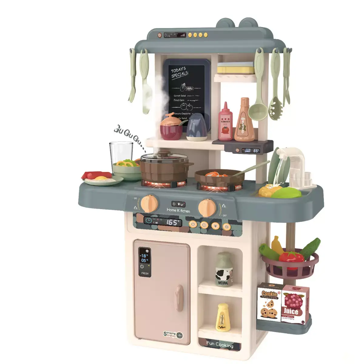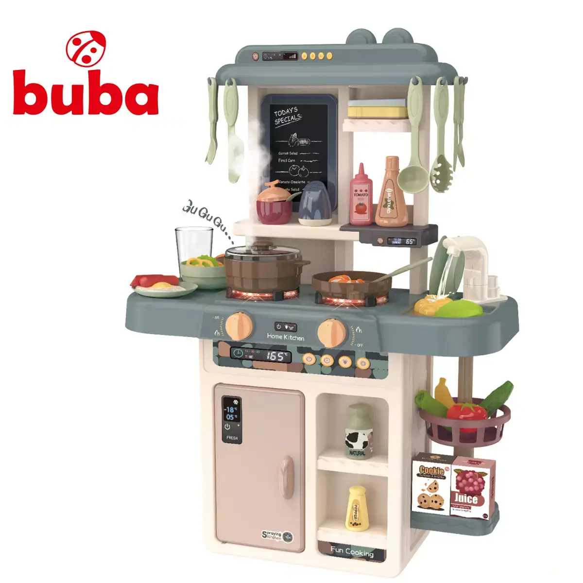 Детска интерактивна кухня с вода и с аксесоари Buba Home Kitchen с хладилник и 42 аксесоара ще зарадва малката домакиня с отличната си функционалност! Подходяща за малки домакини, които наистина искат да се научат да готвят като мама. Кухнята има звукови и светлинни ефекти. Компактен размер, но стабилна конструкция, естетична изработка, пастелни цветове, богато оборудване. Захранва се с 3 x AA батерии. Кухнята разполага с кран с мивка, от която тече вода: За да започнете играта с вода, трябва да излеете около 1 чаша вода в мивката. Когато натиснете специален бутон зад крана, от него започва да тече вода. Циркулацията на водата е циклична - тоест по време на игра няма нужда да добавяте допълнителни порции вода към мивката. Функция пара на единия от тях: Малко количество вода се изсипва в котлона за да се активира функцията. Парата е безвредна, работи на принципа на овлажнителите. Котлоните светят и имат звуци за готвене и пържене, черна дъска за водене на бележки, отварящ се хладилник. Аксесоарите – всичко необходимо за едно приятно изживяване: Съдове, хранителни продукти и аксесоари Функции: Ко
