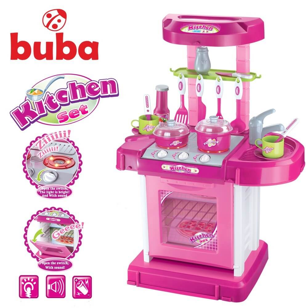 Кухнята Buba е чудесна играчка, от която детето Ви няма да иска да се откъсне. С кухненската печка детето може да имитира истинската работа в кухнята. Вашето дете ще се почувства като истински готвач. Кухнята ще развие въображението му в подготовка на любимите ястия. При включване на котлона или отваряне на фурната кухнята издава звук. Комплектът включва редица аксесоари, които добавят разнообразие в детското забавление. Комплектът се сгъва в малък куфар, който не заема много място и е лесен за пренасяне. Модерен и уникален дизайн. Интересният вид на кухнята и звуците по време на готвене карат всички деца да се съберат около нея. Играчката се захранва от 3 бр АА батерии (не са включени в комплекта). Комплектът включва: - Два котлона - Солничка - Мивка - Фурна - 15 кухненски съда (тенджери, тигани, прибори, черпаци, чаши, и т.н.) - Стойка за прибори Размери: Широчина: 42 см Дълбочина: 25 см Височина: 65.5 см Подходящ за деца над 3 години!