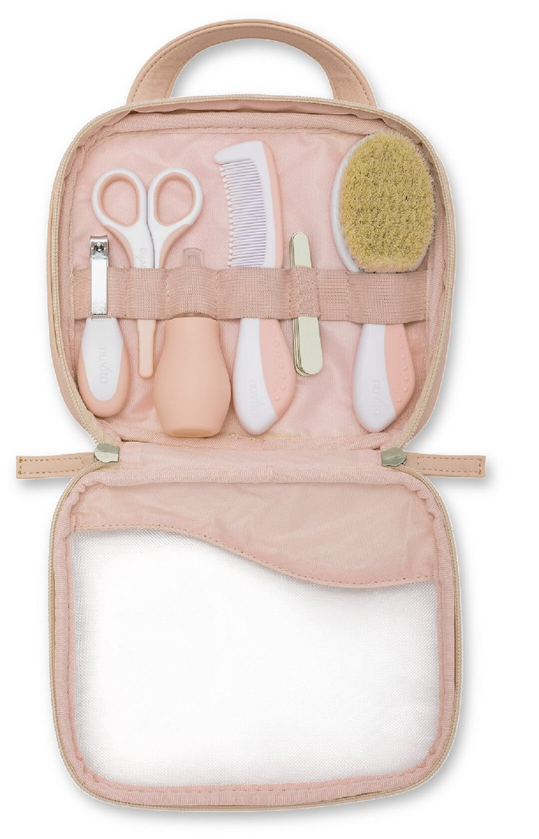 Стилен комплект с аксесоари за хигиена и грижа за новородено Чантичката има удобна дръжка, която може да се използва както за носене така и за окачване. Благодарение на напълно отварящ се в двете посоки цип, лесно и бързо имате достъп до всички аксесоари. А вътре има специално обособени места за всеки аксесоар, за да бъде винаги всичко на мястото си. Всичко това е в луксозна кутия, идеално за подарък! Аксесоари включени в комплекта: 1 четка с четина от естествен косъм, много нежна към първата бебешка коса 1 гребен със заоблени връхчета и ергономична форма 1 ножица без никел със заоблен връх 1 нокторезачка без никел с ергономична дръжка 1 ръчен назален аспиратор за почистване на ноздрите 5 картонени пили за заглаждане ъглите на ноктите Калъф с отделения за всеки аксесоар Подаръчна кутия
