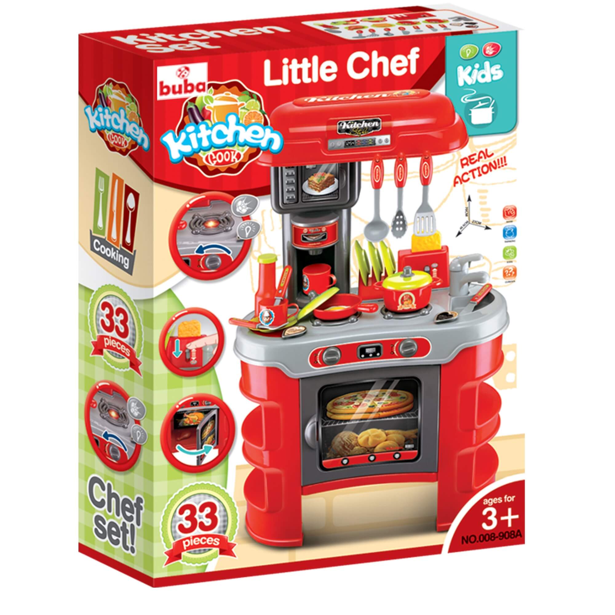 Кухнята Buba е чудесна играчка, от която детето Ви няма да иска да се откъсне. Играчката се захранва от 2 бр АА батерии (не са включени в комплекта). Комплектът включва: - Два котлона - Солничка - Мивка - Фурна - Кухненски съдове (тенджери, тигани, прибори, черпаци, чаши, и т.н.) - Стойка за прибори - Тостер Размери: Широчина: 45.5 см Дълбочина: 26.1 см Височина: 69 см Подходящ за деца над 3 години!