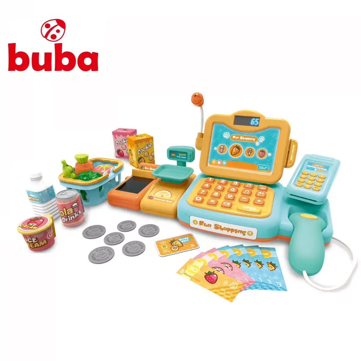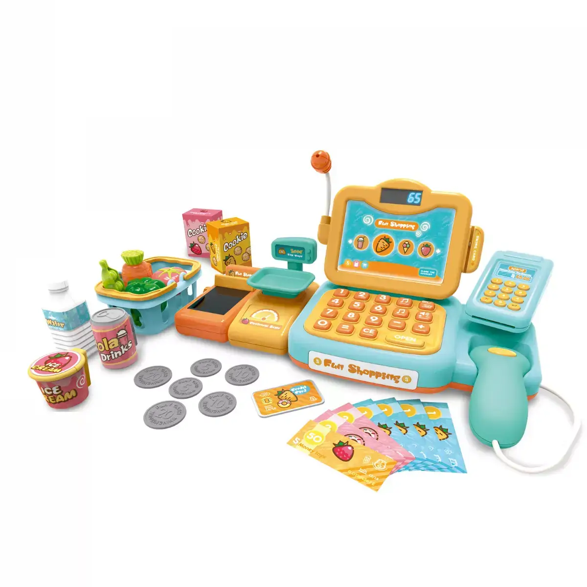 Детски касов апарат Специално за малките любители на пазаруването! Напълно оборудвана каса с продукти! Включва електронен касов апарат със скенер, везна за плодове и зеленчуци, POS терминал с карта, микрофон и калкулатор. Кошница пълна с продукти: плодове и зеленчуци, бисквити, напитки, сладолед и вода. Касата има и чекмедже, в което да приберете банкнотите, ако купувачът плаща в брой. Банкнотите и монетите също са част от комплекта! Всички артикули са многоцветни и атрактивно имитират истински стоки и аксесоари за пазаруване. Функционалности: Реалистичен скенер- всеки артикул от комплекта има определена цена. Благодарение на това детето може да сканира цената по време на играта, която ще се показва на дисплея на касата. Просто доближете скенера до изпъкналата част на продукта и натиснете бутона на устройството. Плащане на сметката: След като изчислите сумата на покупката, можете да ги платите с карта, като я поставите в терминала или плъзнете на определеното място на монитора. Вторият вариант на плащане е банкнота или монети. Звукови ефекти: Касата издава много интересни звуци,