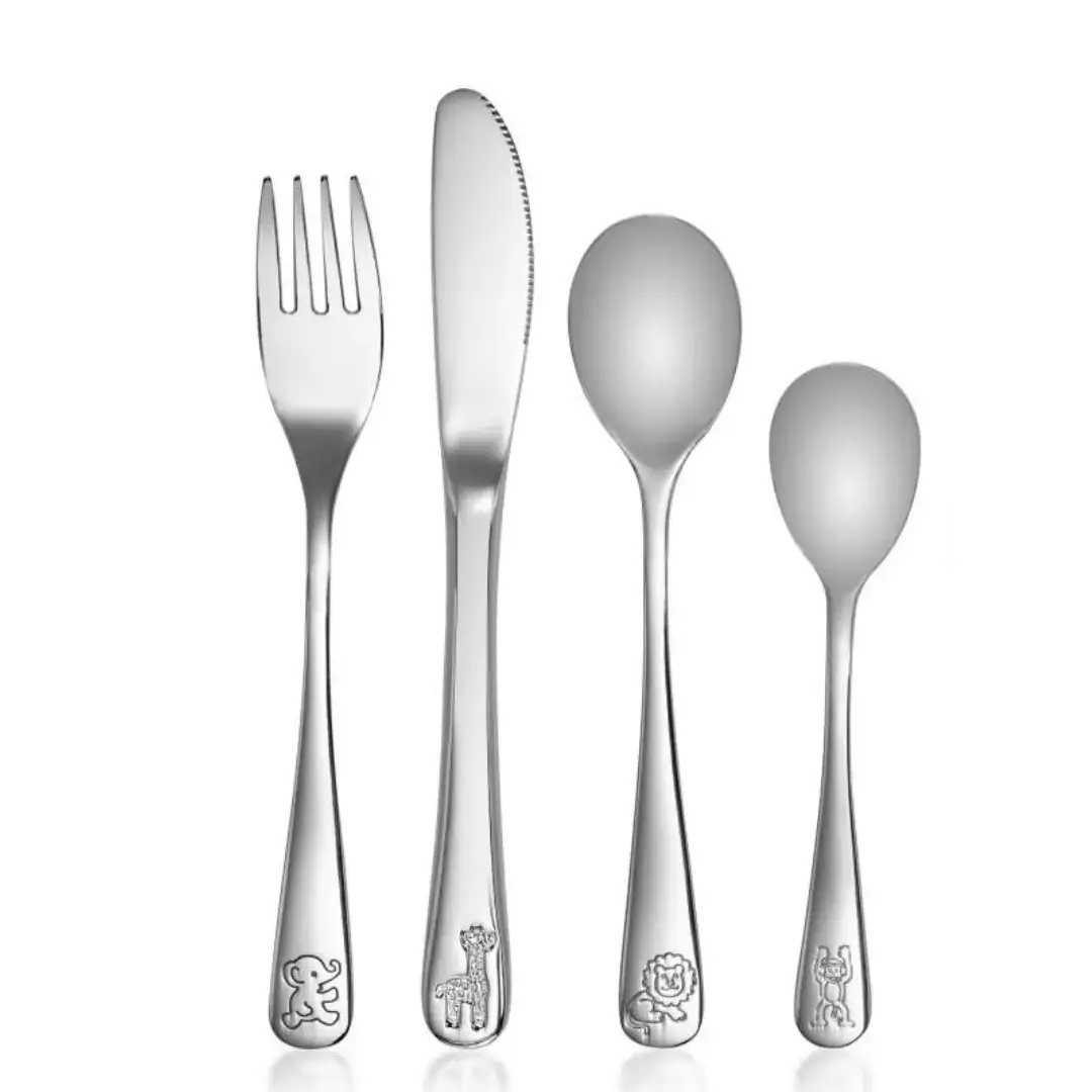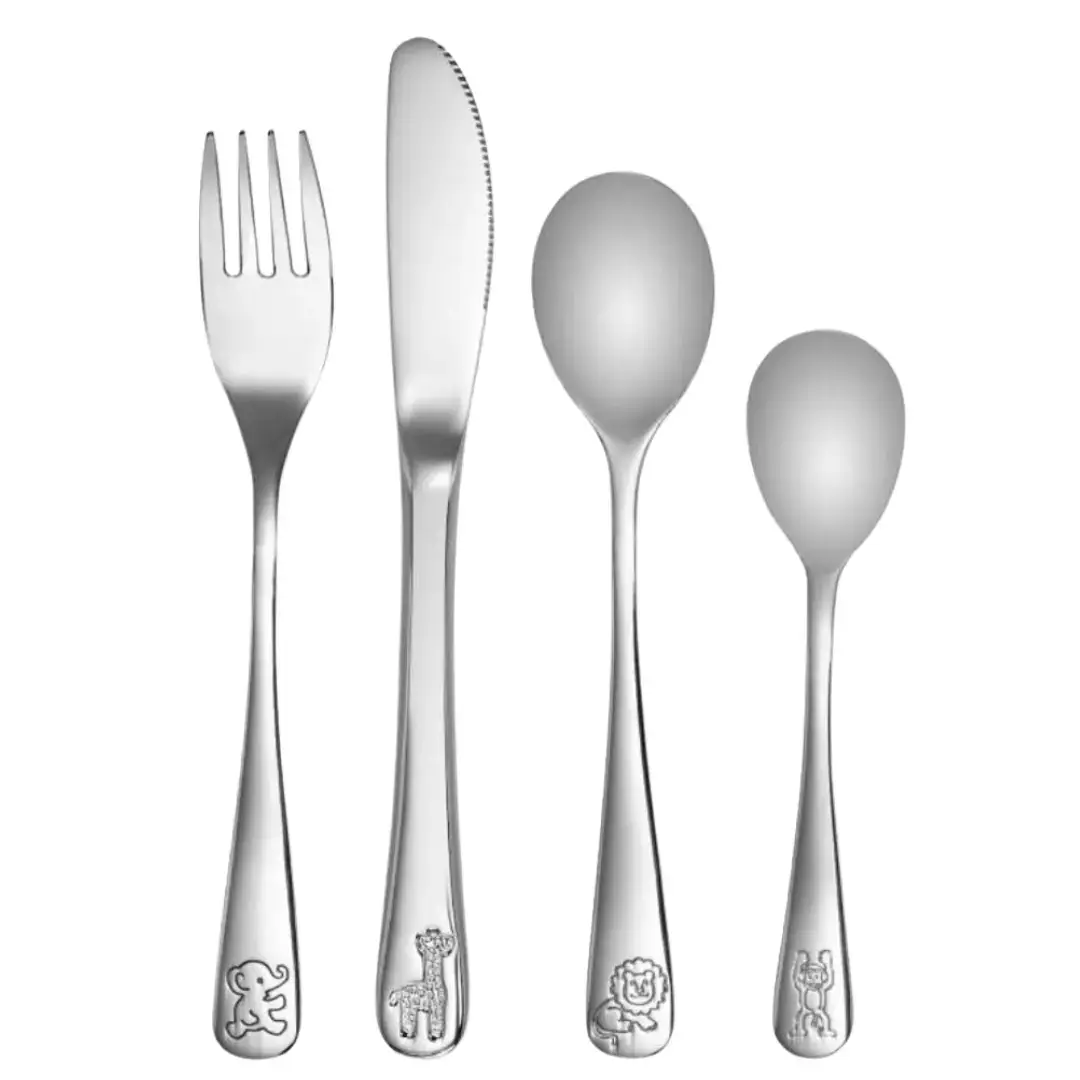 Още едно попълнение в серията GROWING, която е с мисъл за околната среда! Този комплект включва 4 детски прибора от закалена стомана. Перфектната алтернатива на пластмасата! Предимства: Оформени, пасват добре в малки ръце, без остри ръбове С красиви животински мотиви Могат да се мият в миална машина, не е подходящ за микровълнова печка Стандарта за безопасност EN 14372 Спецификация: Материал - неръждаема хромирана стомана 18/10 Съдържание: нож, вилица, лъжица и десертна лъжичка Луксозна подаръчна кутия