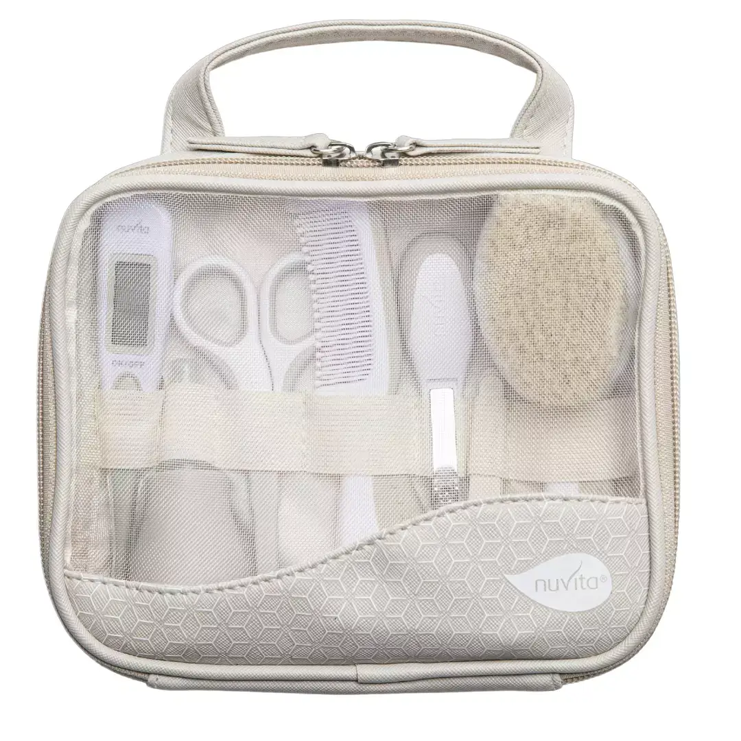 Стилен комплект с аксесоари за хигиена и грижа за новородено Чантичката има удобна дръжка, която може да се използва както за носене така и за окачване. Благодарение на напълно отварящ се в двете посоки цип, лесно и бързо имате достъп до всички аксесоари. А вътре има специално обособени места за всеки аксесоар, за да бъде винаги всичко на мястото си. Всичко това е в луксозна кутия, идеално за подарък! Аксесоари включени в комплекта: 1 четка с четина от естествен косъм, много нежна към първата бебешка коса 1 гребен със заоблени връхчета и ергономична форма 1 ножица без никел със заоблен връх 1 нокторезачка без никел с ергономична дръжка 1 ръчен назален аспиратор за почистване на ноздрите 5 картонени пили за заглаждане ъглите на ноктите 1 безконтактен термометър Калъф с отделения за всеки аксесоар Подаръчна кутия