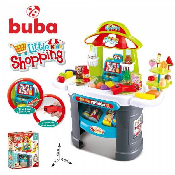 Детският супермаркет Buba е фантастична играчка за всяко момче или момиче. Играчката имитира истинско пазаруване в супермаркет и предлага голямо разнообразие от аксесоари и продукти. Комплектът ще осигури на всяко дете много забавления като го научи да брои, да пазарува, да плаща и да връща ресто. В кoмплекта: - Щанд за продукти с рафтове - Каса с чекмедже и бутони - Скенер със звукови и светлинни ефекти - Имитация на банкноти и монети - Плодове и зеленчуци - Поставка за сладолед - Имитация на продукти в картонени кутии и пластмасови бутилки Захранва се с 2 бр. АА батерии (не са включени в комплекта) Размери: Широчина: 66 см Дълбочина: 25 см Височина: 68 см За деца над 3 годишна възраст