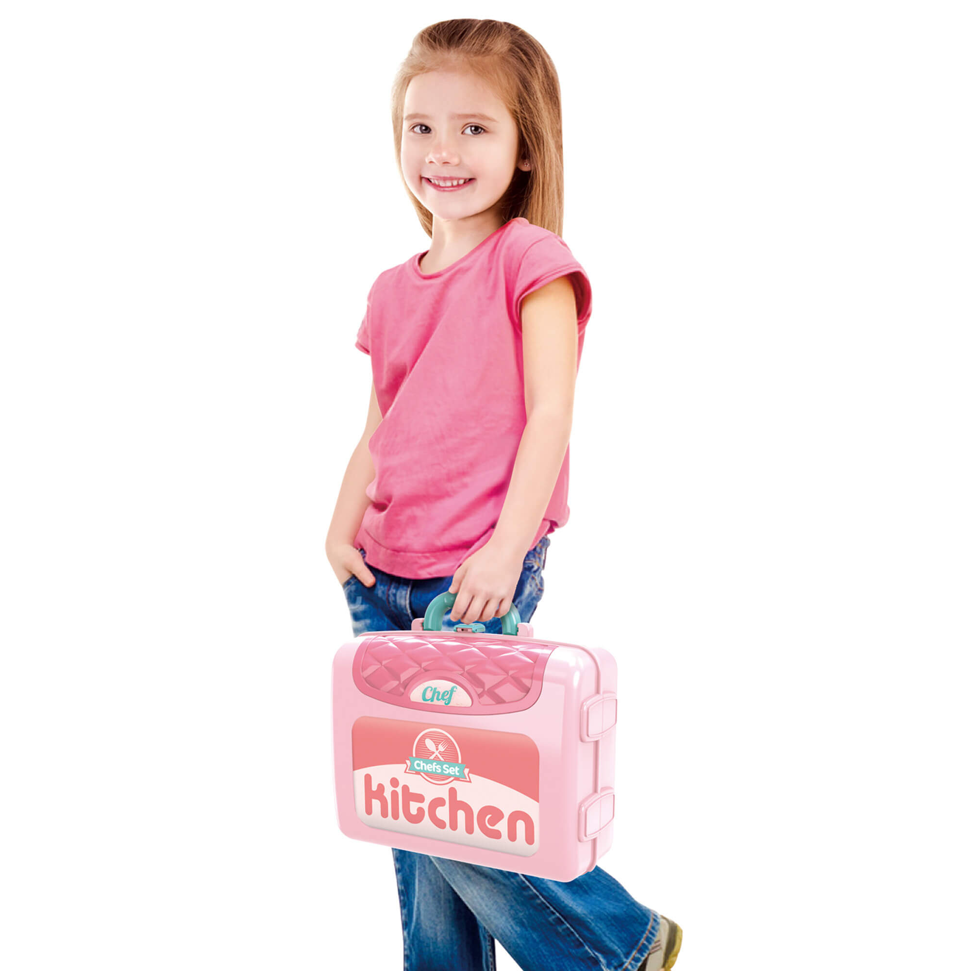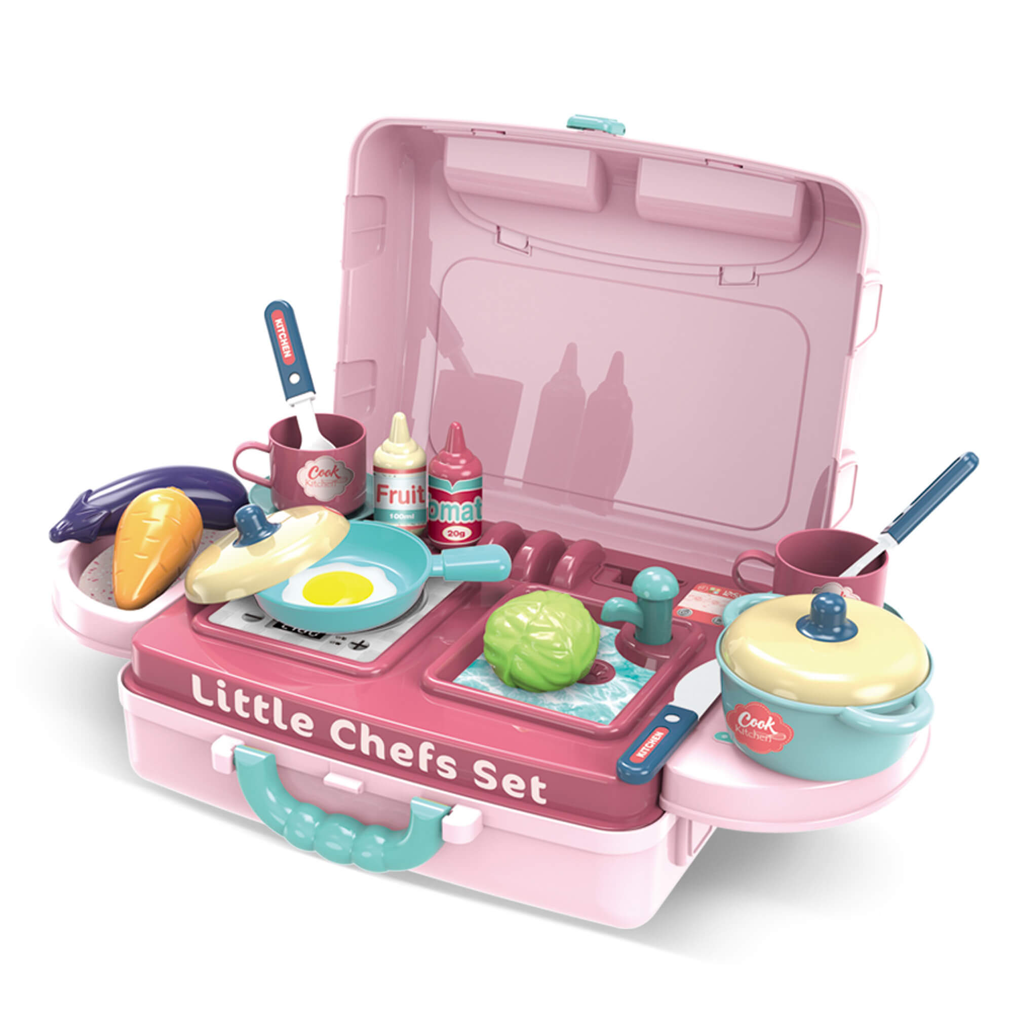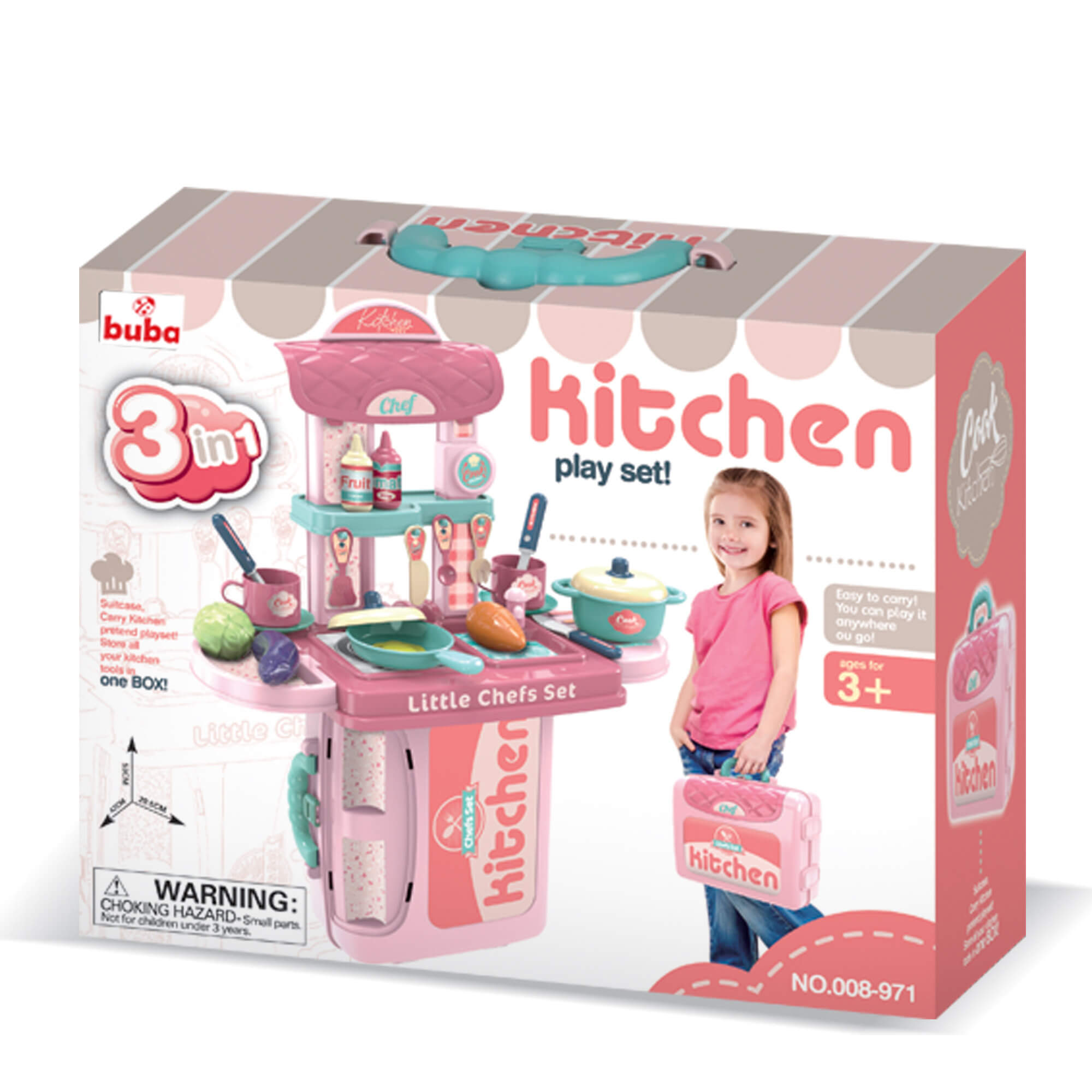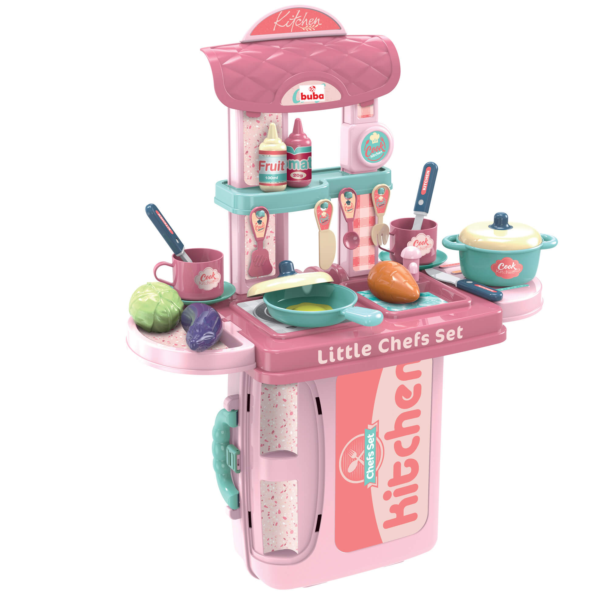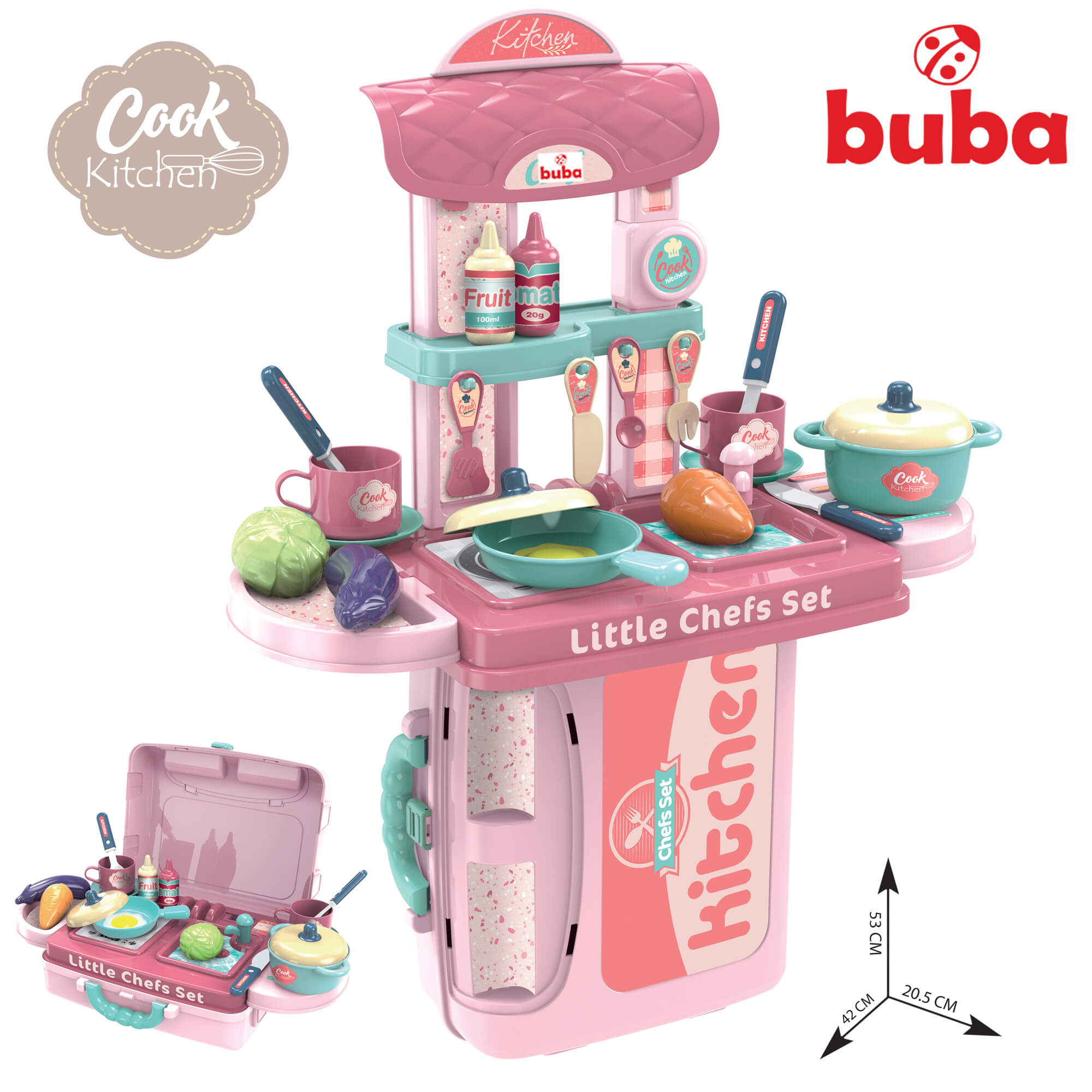 Комплектът за игра ще зарадва малката домакиня и помощник. Ярките, атрактивни цветове, висококачествената пластмаса няма да разочарова родителите.Този комплект ще създаде основата за развитието на въображението на детето, социалните и практически умения. Докато играе, детето получава нова информация за заобикалящия го свят, учи се да взаимодейства и общува.Комплектът може да бъде опакован в компактен куфар, в който е удобно да се съхранява и транспортира. С помощта на допълнителни елементи от комплекта куфарът може лесно да бъде превърнат в мини-кухня с всичко необходимо. Има 2 опции за инсталиране на сглобената кухня. Размери: 42 х 53 х 20.5 см. Съдържание на комплекта: - куфар - висящи рафтове - 2 броя - плот с мивка и котлон - кран за вода - рафт с куки - стелажи 4 бр - козирка аспиратор - декоративен елемент - тенджера с капак - 1 бр - тиган с капак - 1 бр - чаши - 2 бр., чинийки - 2 бр - прибори за хранене - 3 бр - кухненски уреди - 4 бр - бутилки с продукти - 2 бр - продукти - 3 бр