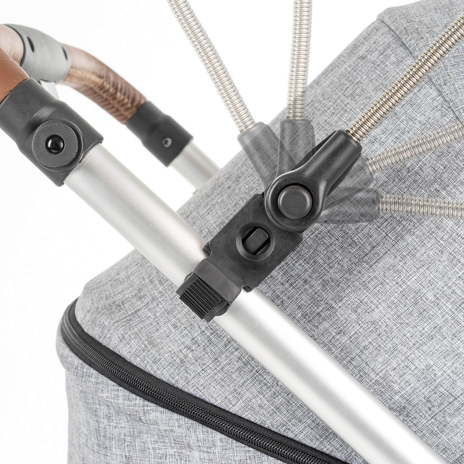 Цялостна защита срещу слънчевите лъчи Младата и нежна кожа на вашето бебе все още не е разработила никаква защита срещу UV лъчи. Няколко минути незащитено излагане на слънце може да е достатъчно, за да изгори кожата. Слънчевото изгаряне е не само много неприятно и болезнено за вашето бебе, но и увеличава риска от кожни заболявания по-късно в живота. Детският чадър ShineSafe предлага перфектна защита от агресивни слънчеви лъчи за вашето малко. Оптимална слънчева защита благодарение на големият размер Чадърът осигурява приятна сянка на вашето бебе в детската количка в слънчеви дни. С диаметъра си от 80 см и квадратната си форма, той предлага значително повече сянка от повечето други детски чадъри. Това също ви спестява, че трябва постоянно да настройвате чадъра към местоположението на слънцето. Защита срещу вредните UV лъчи Чадърът е направен от 100% полиестер понг. Твърдите му, плътно изтъкани пластмасови влакна абсорбират до 98% от слънчевите лъчи. Предлага на чувствителната кожа на вашето бебе максималната UV защита 50+. Регулируемо по посока на слънцето заради чупещата се основа