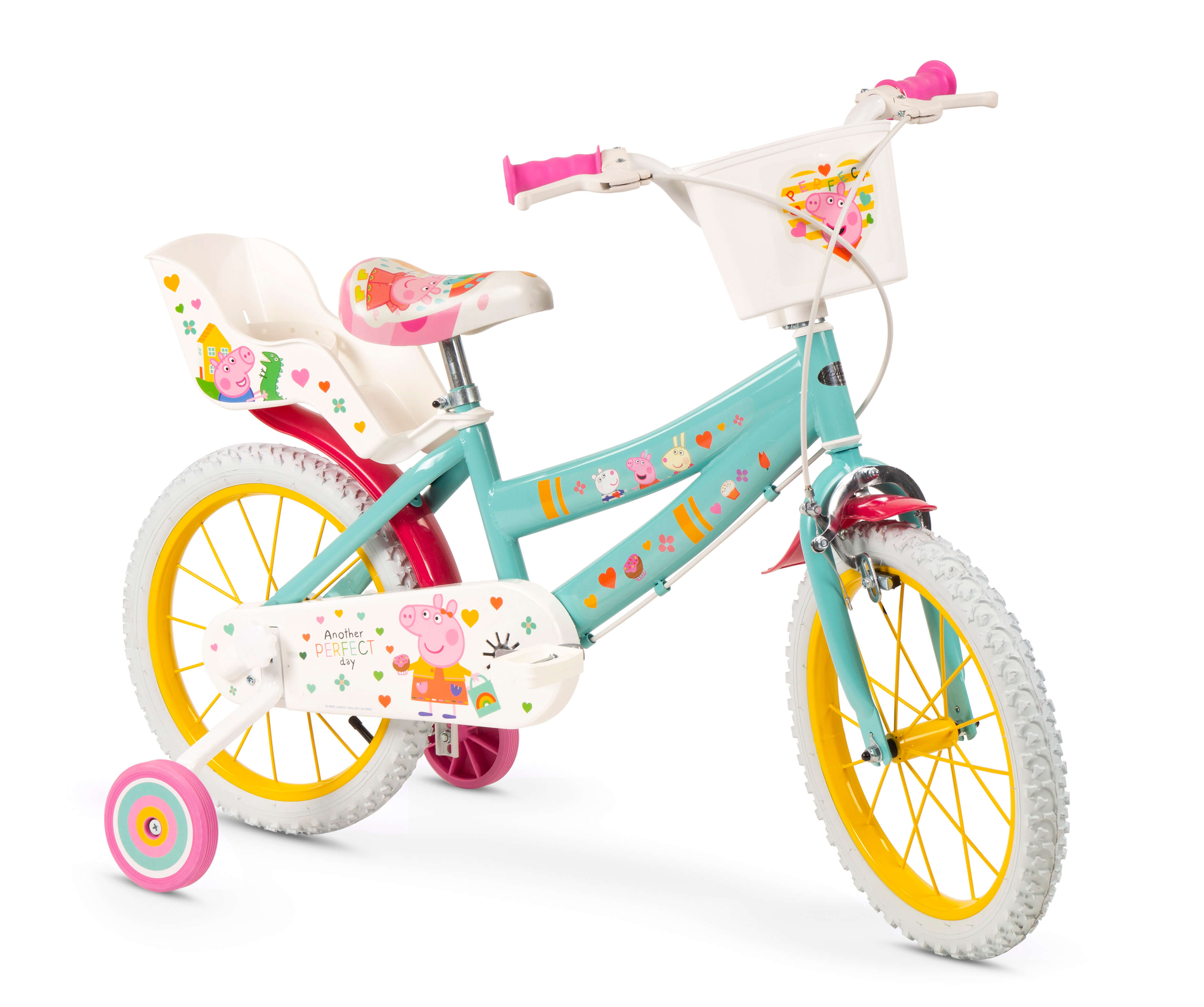 Истински привличащ вниманието велосипед!- 16 инчови колела - Спирачка на джанта отпред, барабанна спирачка отзад - Подвижни помощни колела - Кош за багаж С този велосипед в цветен дизайн на Peppa Pig, младите състезатели са на първите си обиколки по особено шик и безопасен начин. Благодарение на подвижните помощни колела и регулируемата по височина седалка и кормило, велосипеда расте с размерите и уменията на ездача. Спирачката на джантата отпред и барабанната спирачка отзад, с удобни за децата дръжки на кормилото, гарантират безопасно ускорение. Над веригата е монтиран предпазител, който предпазва от наранявания. По време на обиколки в лошо време калниците предпазват от дъжд и кал. И тъй като е важно да има къде да возите любимите предмети, отпред на кормилото има кош за най-важните неща. Така че нищо не стои на пътя на разходките с първия собствен велосипед. Подробности:- Стоманена рамка със стикер в Peppa Pig дизайн - Спирачка за джанта отпред, барабанна спирачка отзад, с удобна за деца дръжка на спирачката - Стикер за предните и задните помощни колела - Гуми с дебел профил на ст...