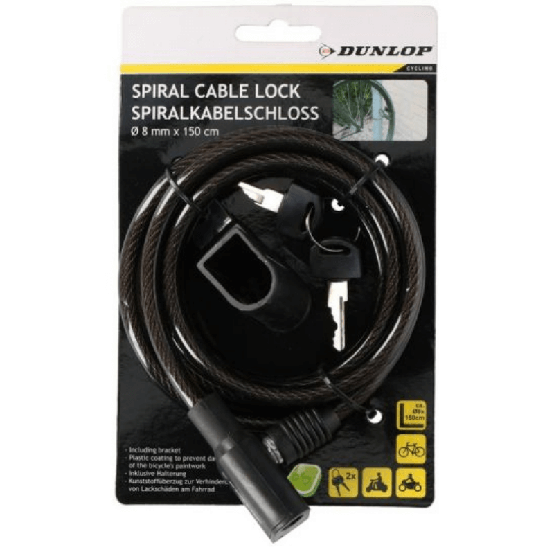 Спирална закопчалка против кражба с Dunlop® ключ. Покритие с пластмаса за защита на рамката от надраскване. Оборудван с автоматичен цилиндър и 2 плоски ключа. Благодарение на дългата закопчалка - 150 см, можете безопасно да закрепите един или няколко велосипеда наведнъж. Освен това има дръжка, която позволява закачане на рамката. Характеристики на продукта: · Автоматичен цилиндър · 2 плоски ключа · Скоба за закачане на рамката · Дължина: 150см · Диаметър: 8 мм